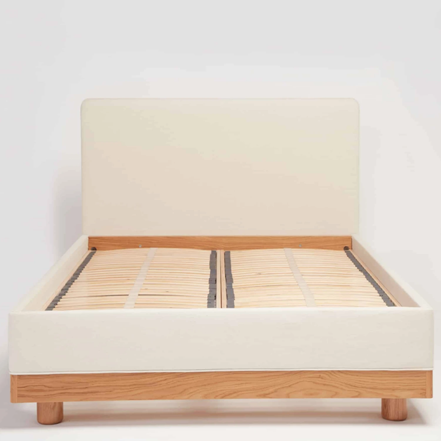 Oak Veneered Poplar Core Plywood & Organic Wool, with Beech slats. Upholstered frame & headboard available in Miro by Romo in selected colours.