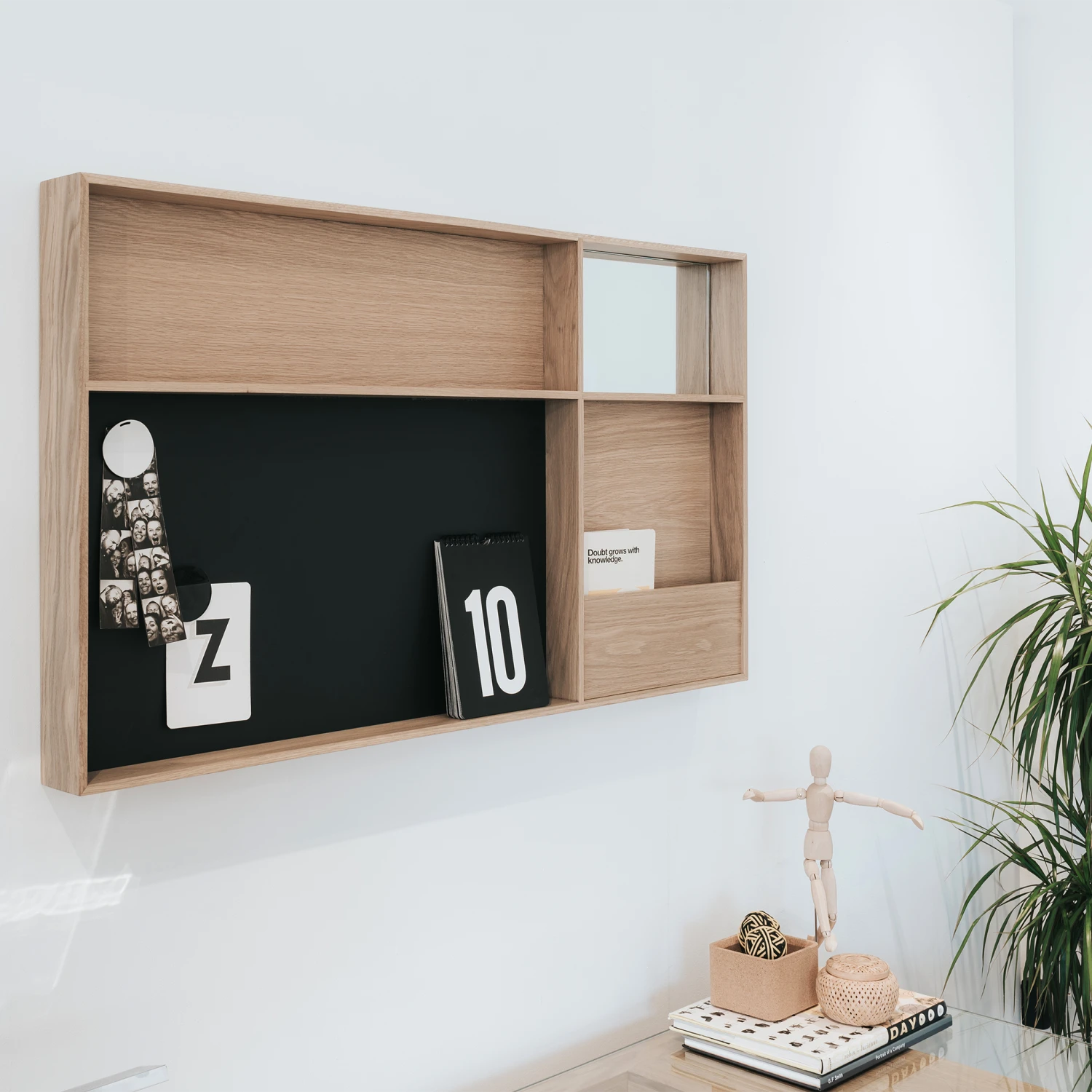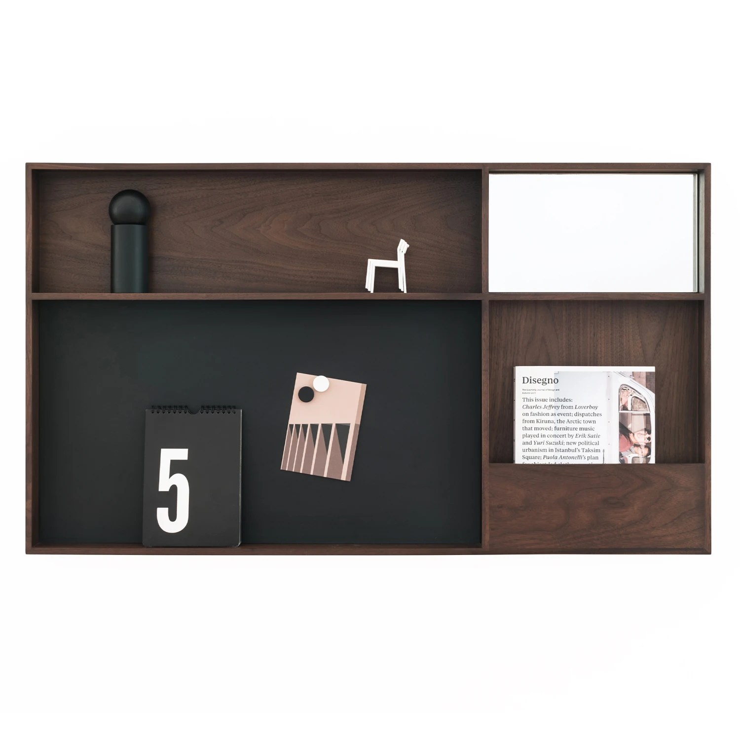 Keep your space clutter free with the elegant Arca Wall Boxes designed by David Irwin. Crafted in solid oak or walnut, this practical piece features a mirror, shelf and storage compartments . The rectilinear frames house multiple compartments and are arranged in an inventive grid format to store various everyday objects.