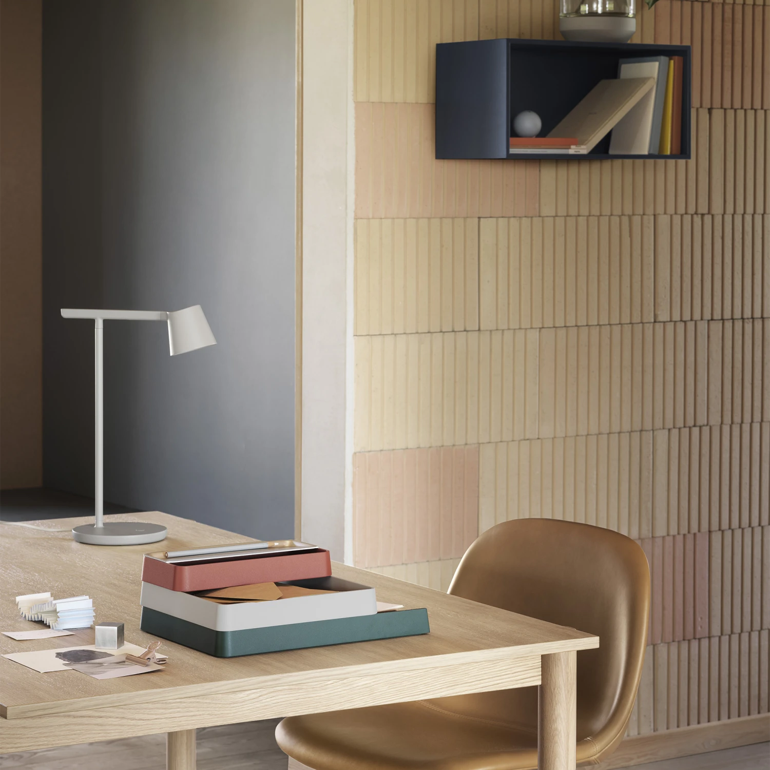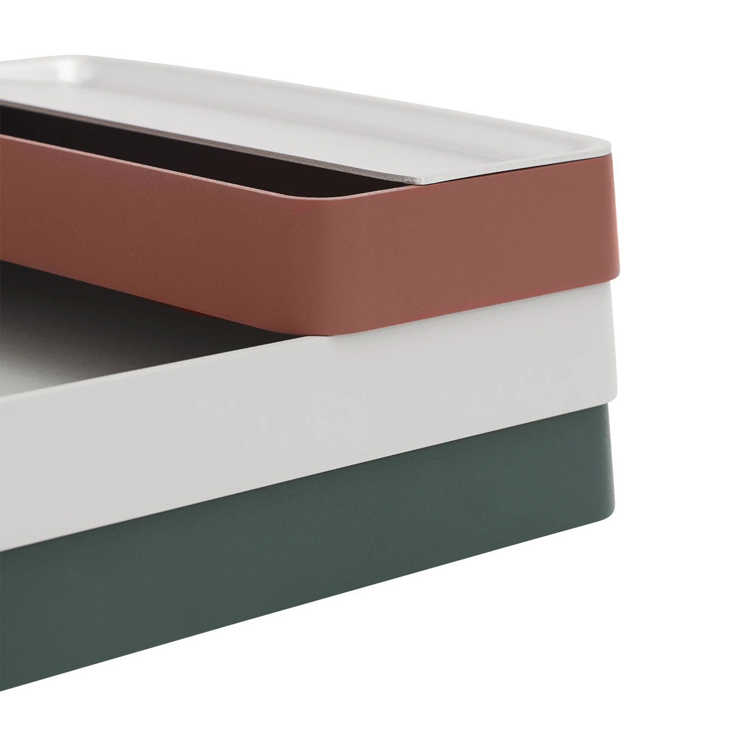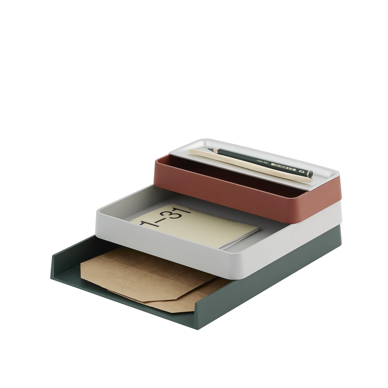 AÂ flexible system that allows you to organise things on a desk or shelf. A focal point in the design process was to make the design playful by encouraging the user to interact with it, using and reconfiguring the combination of trays, paired with an expression that is inspired by contemporary architecture.