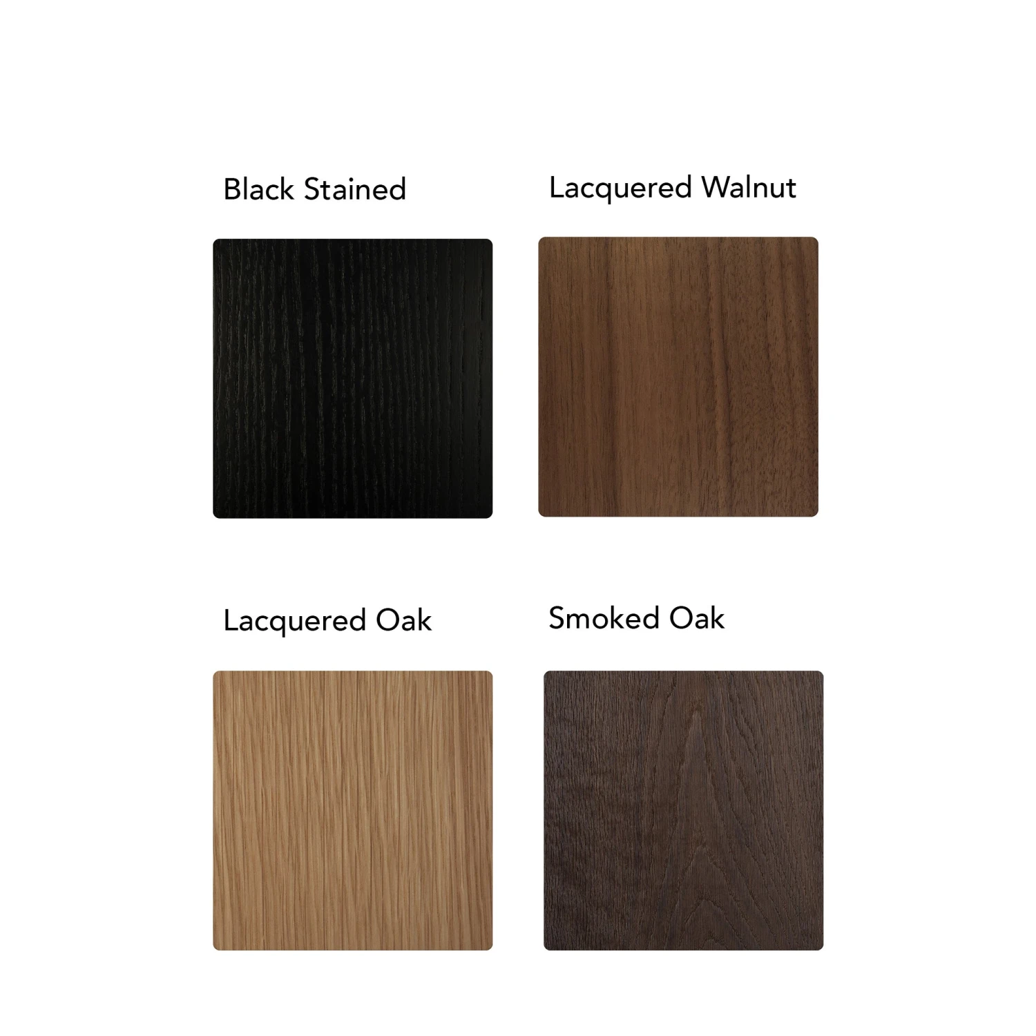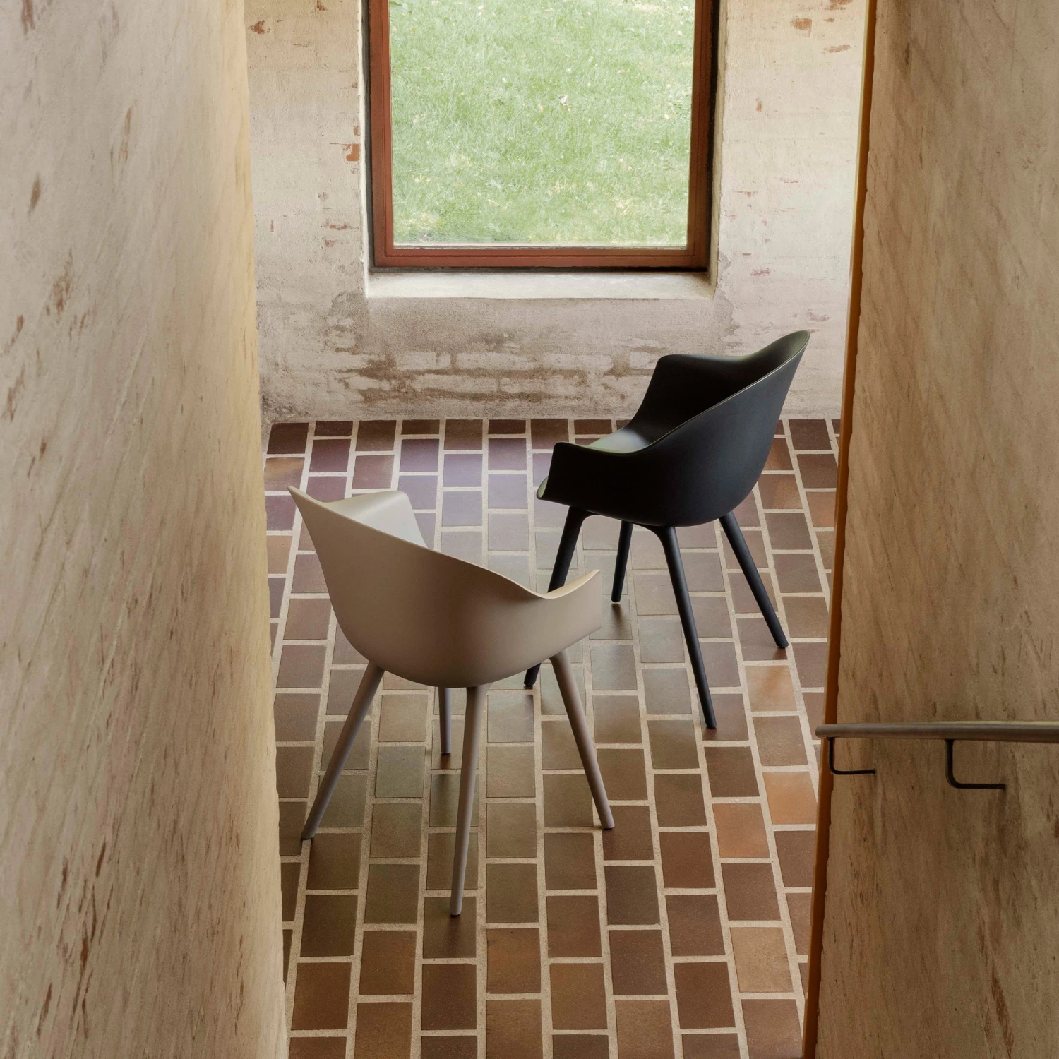 Polypropylene shell in a variety of colours. Base/leg in black stained beech semi matt lacquered, oak semi matt lacquered, smoked oak matt lacquered, or American walnut matt lacquered.