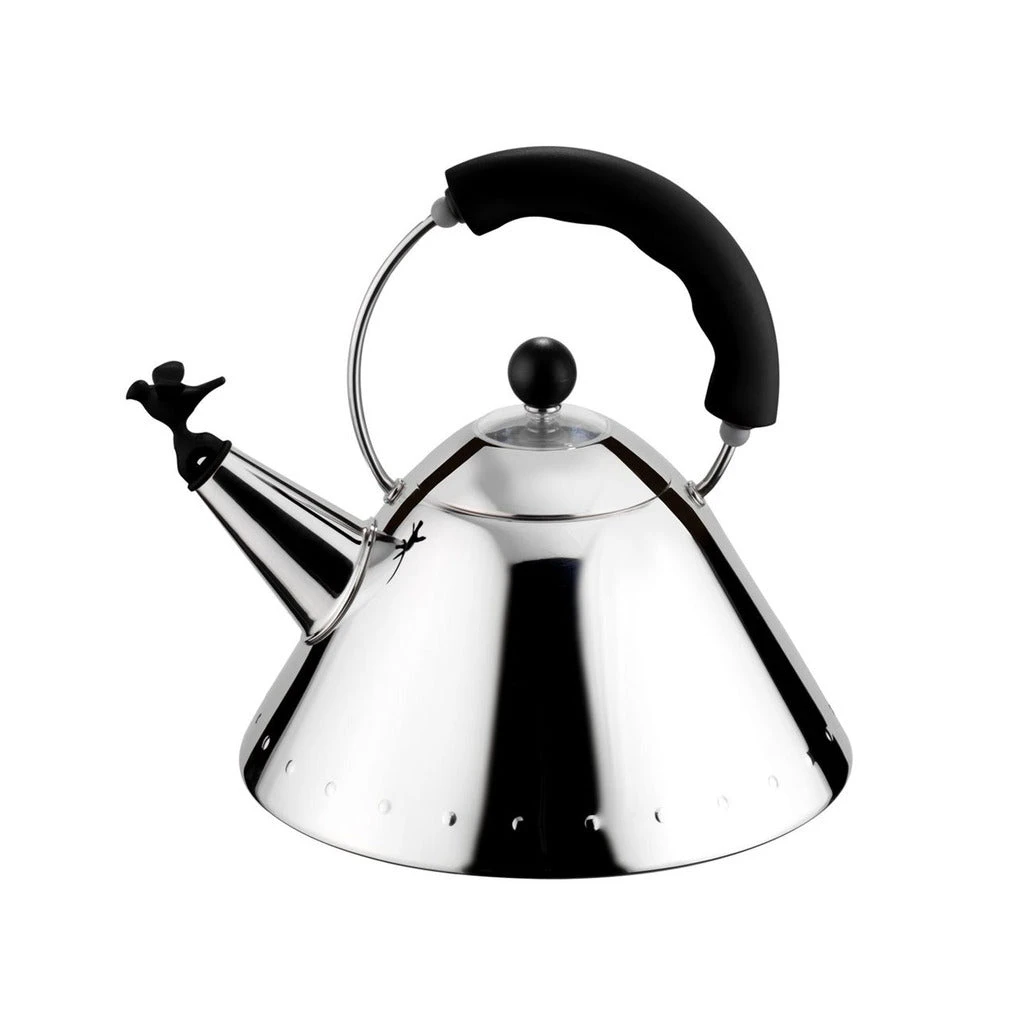 The 9093 ‘Bird’ kettle, with bird-shaped whistle is one of the best-selling Alessi objects in the world. The design of this kettle, created by Michael Graves in 1985, mixes the influences taken from European Art, American Pop and quotes from pre-Columbian cultures.