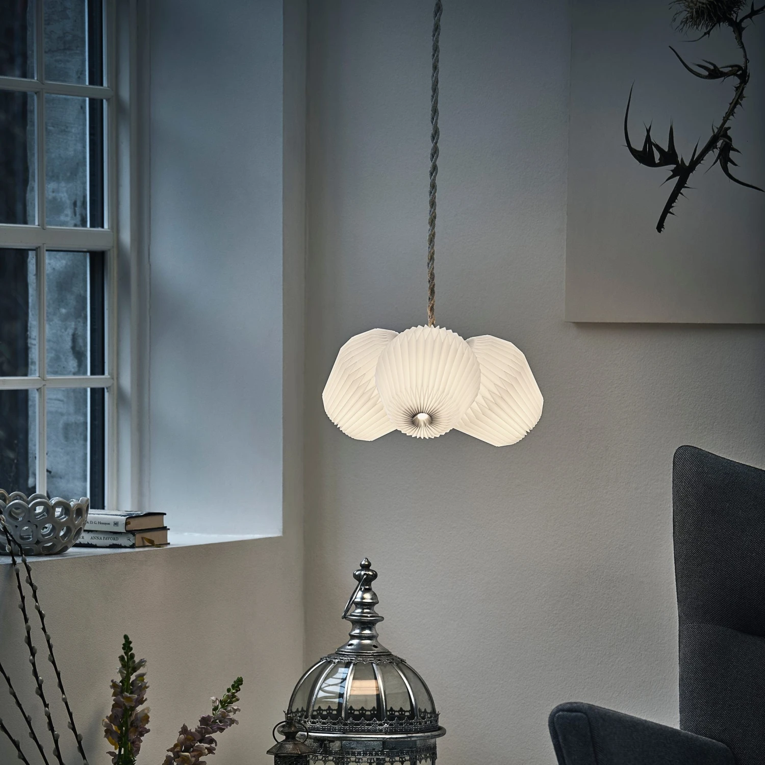The Bouquet 3 has three lamp shades and a braided linen cord.