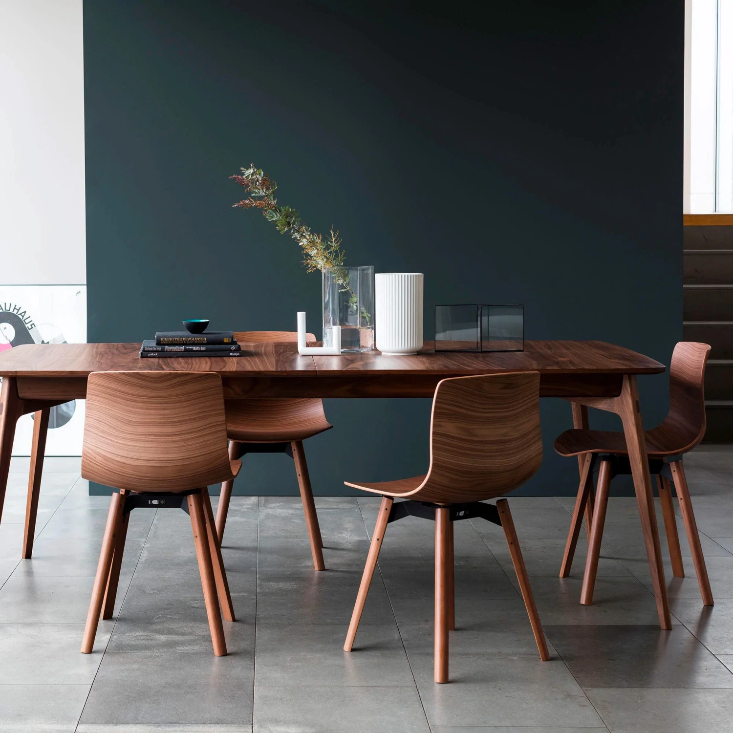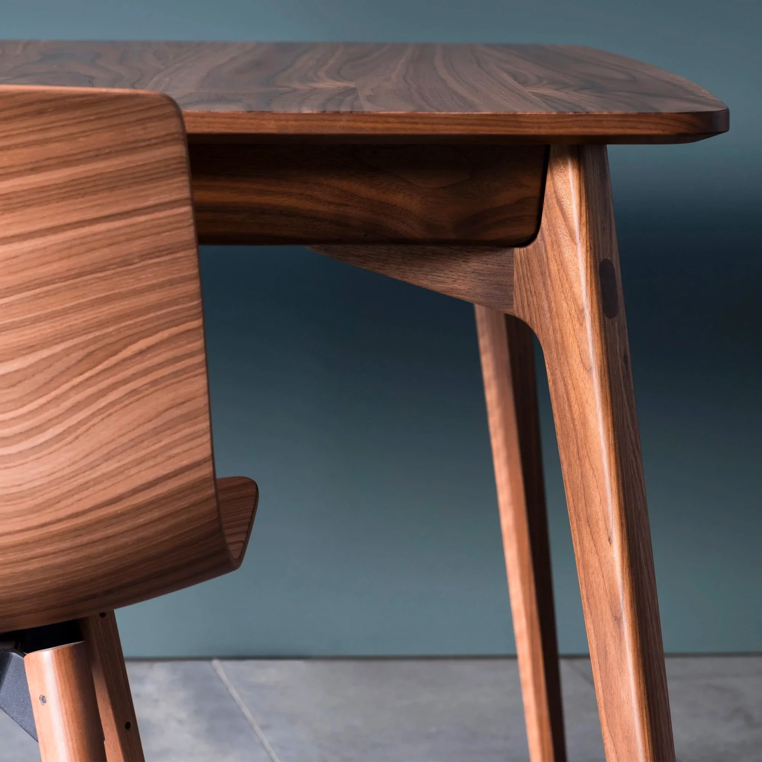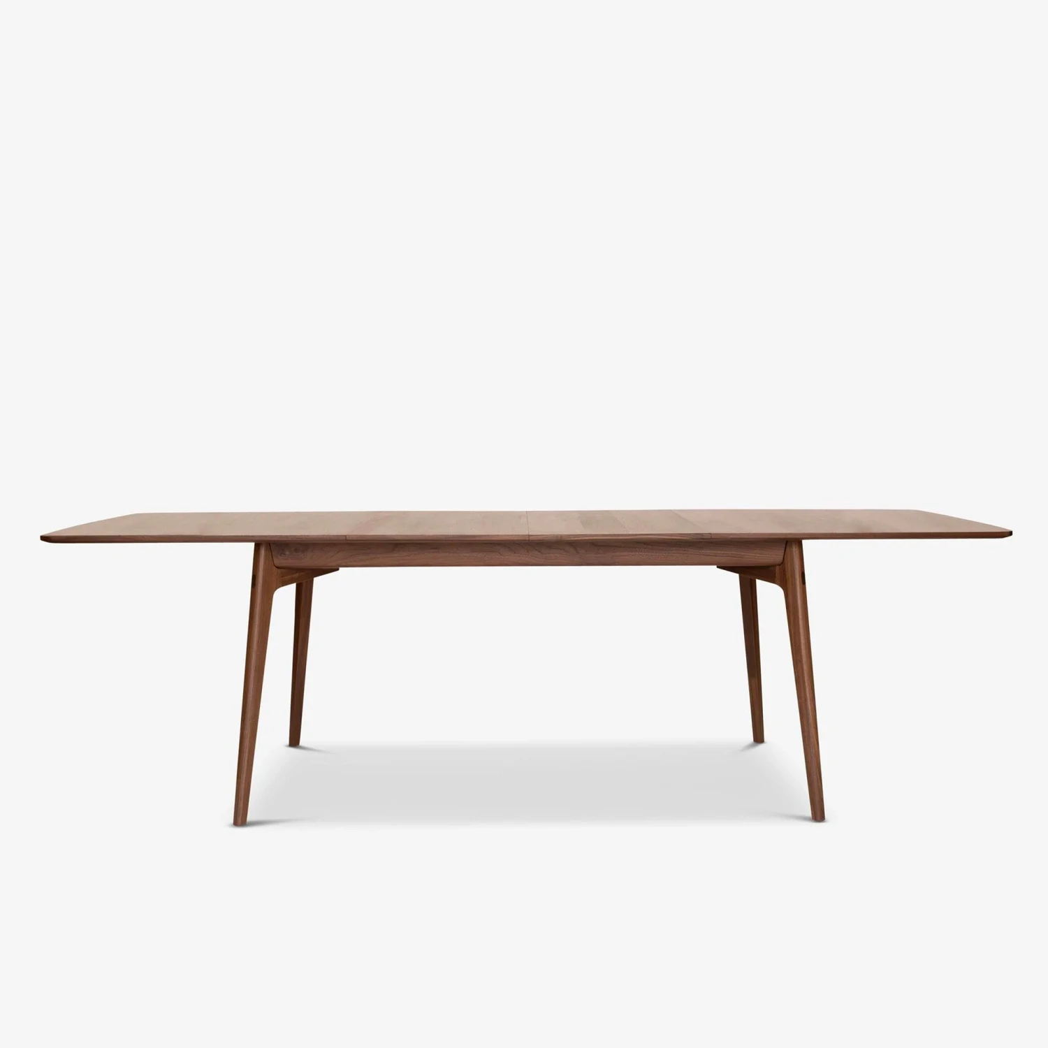 The build quality of the Dulwich table is exemplary, and evident in its materials and finish. It features solid wood legs, edge and under-frame in a choice of oak, walnut or black stain; a veneered top and leaves; felt-lined under-frame leaf storage; mechanical ball-bearing extension system; and is finished with a clear polyurethane lacquer.
