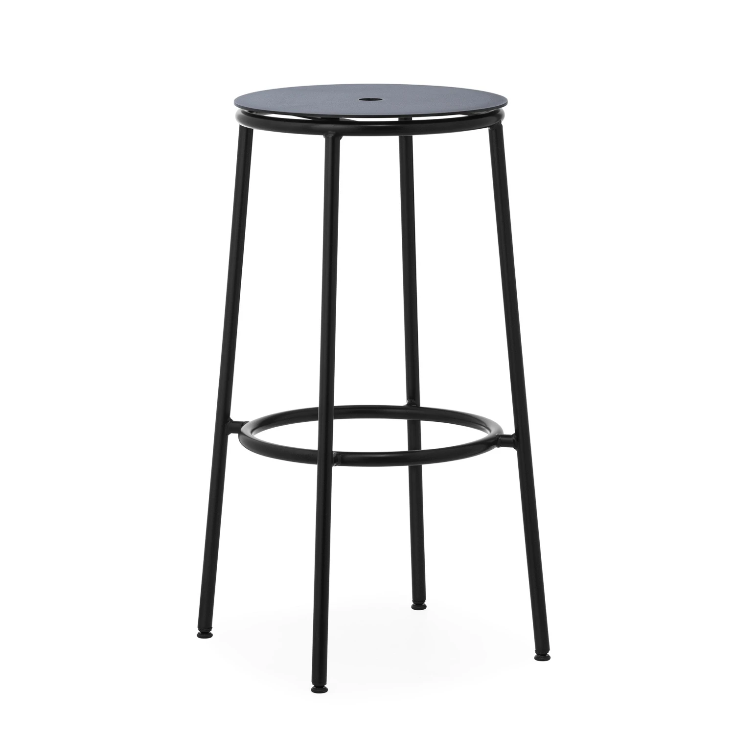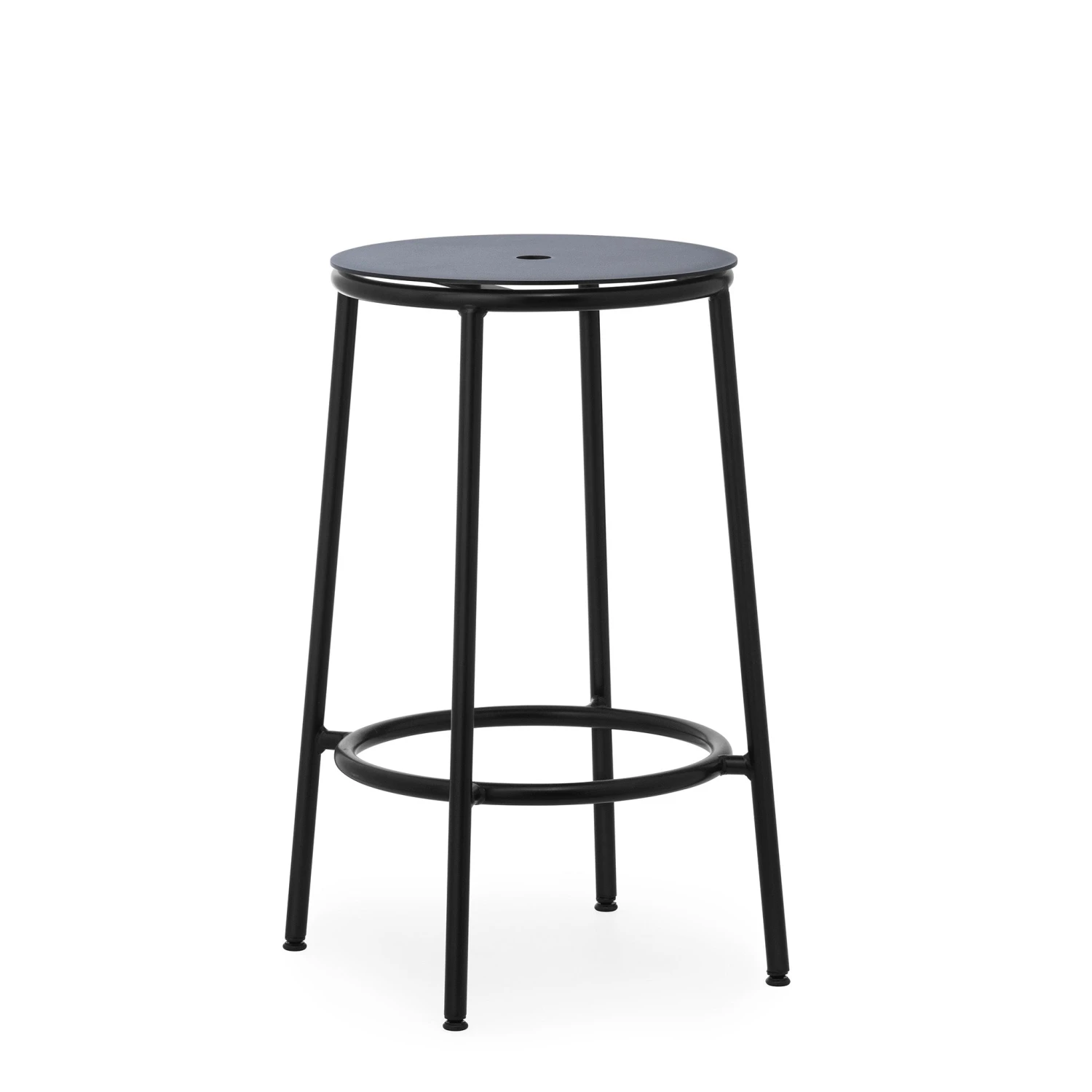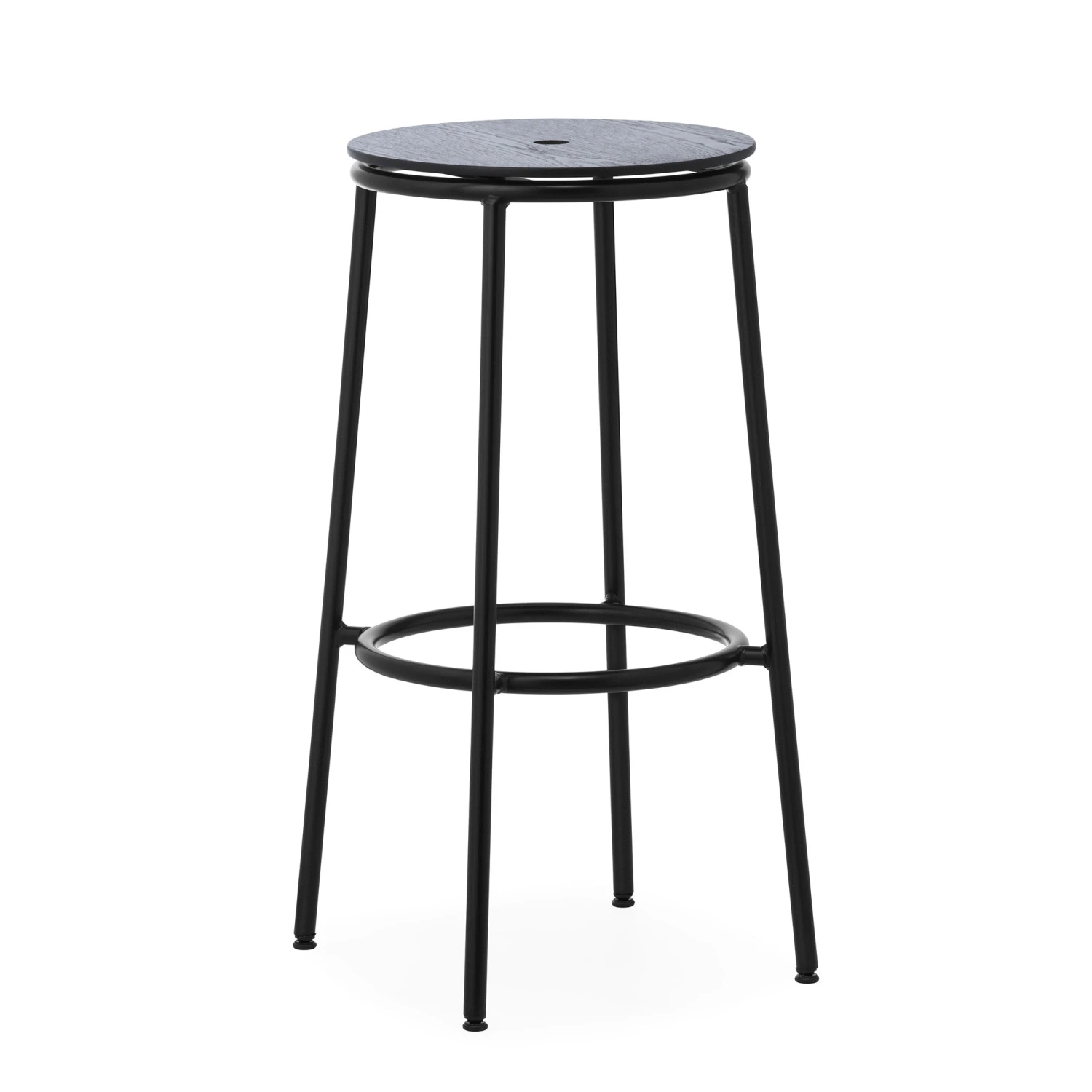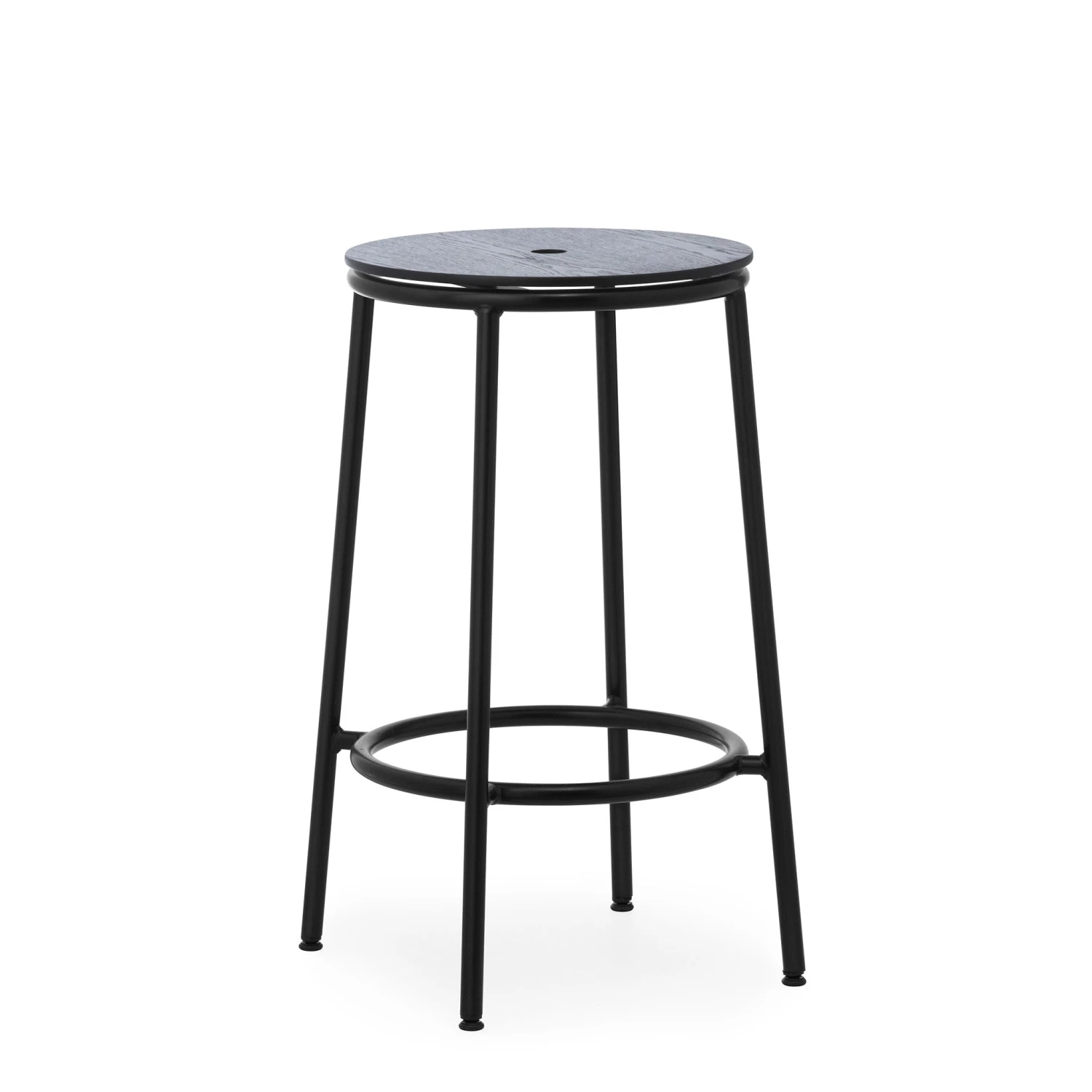 The CIRCA collection consists of minimalist and timeless stools with steel tube frames and circular seats in oak veneer, aluminium or fully upholstered. The circular seat rests on a slender steel base in black powder-coated steel.