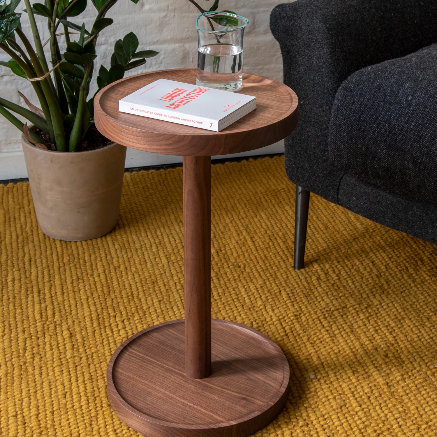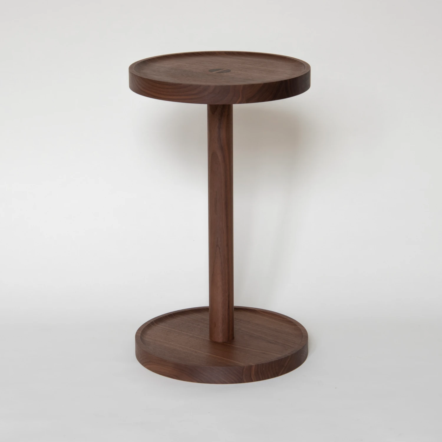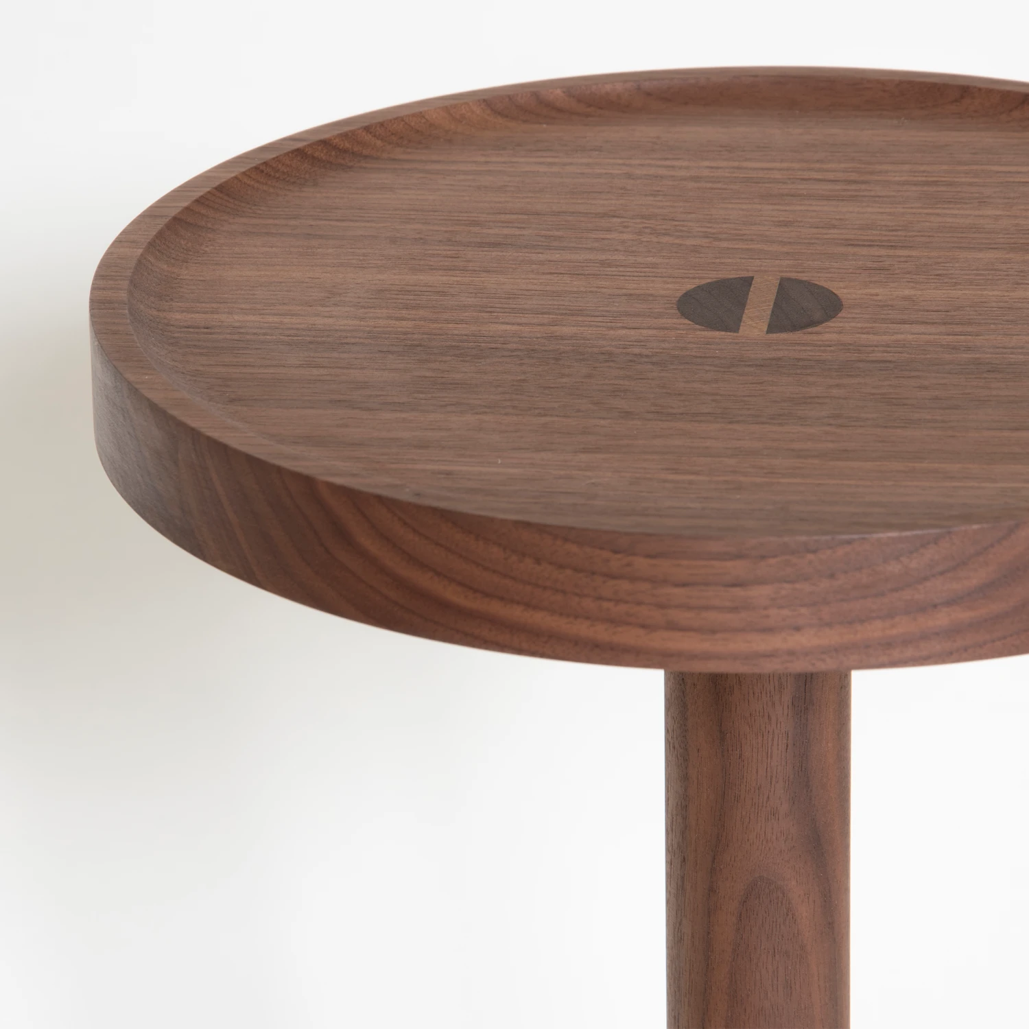 It is made from solid Walnut planks and the circular top and base both feature a raised edge.