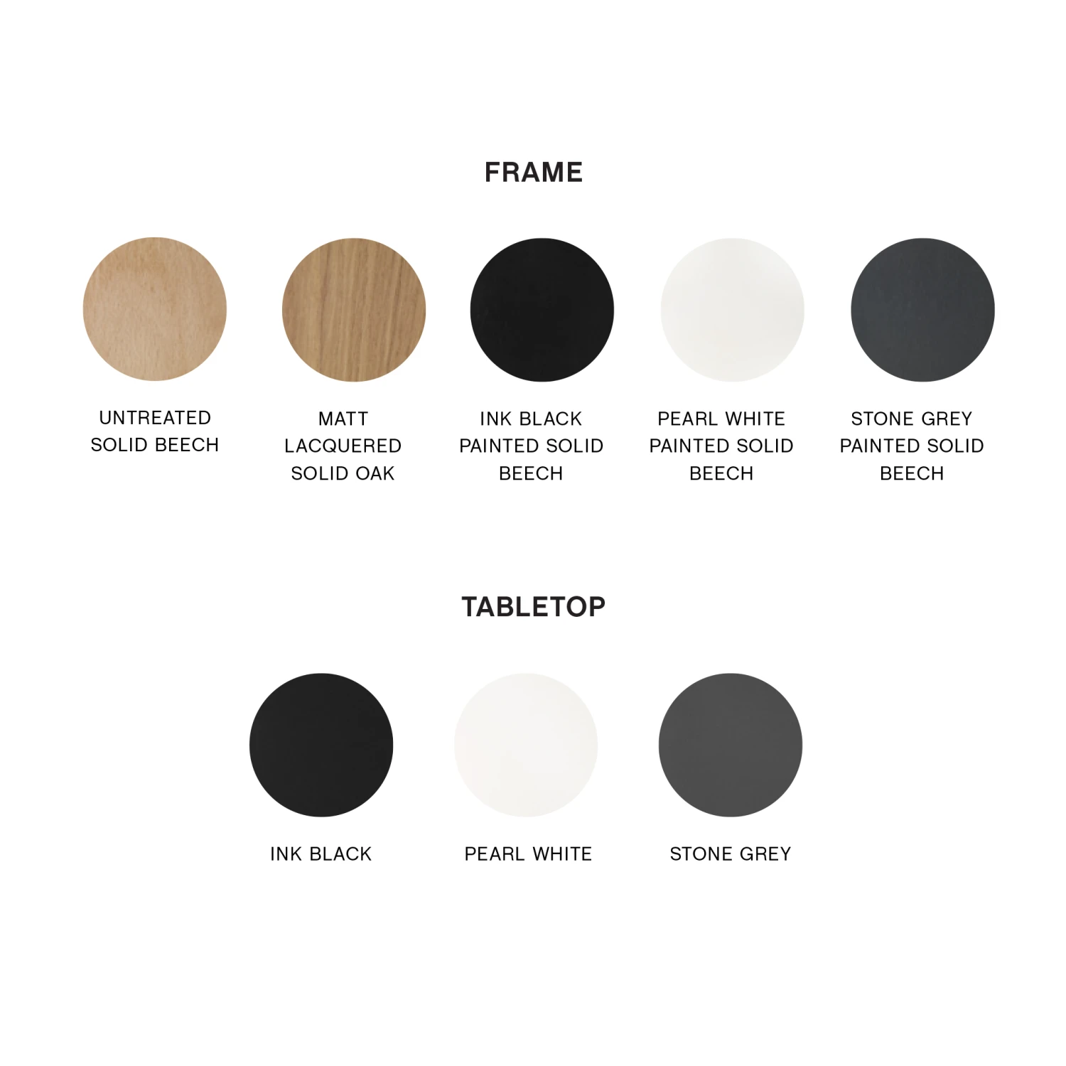 Choose from 3 tabletop laminate colours: pearl white, stone grey or ink black and 3 frame finishes: Lacquered Oak, Untreated Beech or Lacquered to match tabletop laminate colour.
