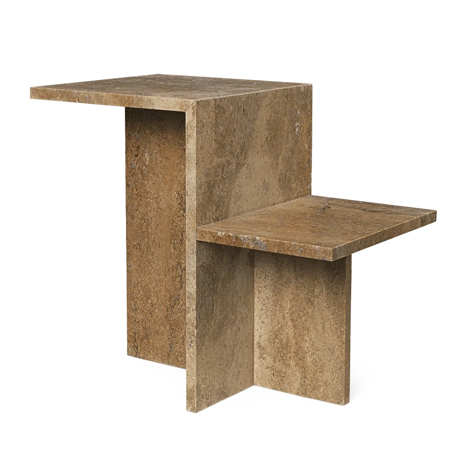 Originally inspired by Japanese minimalism, the Distinct Side Table explores the creation of complex structures based on a single element. The minimalist construction creates a contrast to the richness of the travertine’s earthy textures. With the natural and diverse qualities of the dark or sand-coloured limestone, it provides rawness and tangibility that highlight the architectural character of the furniture piece.