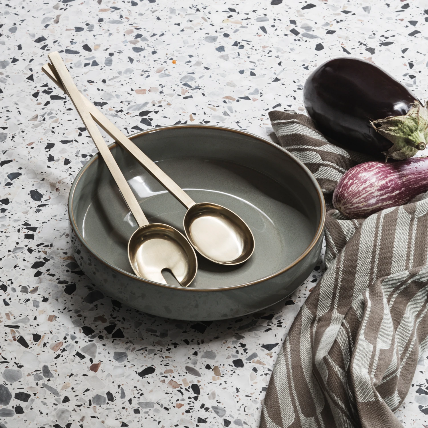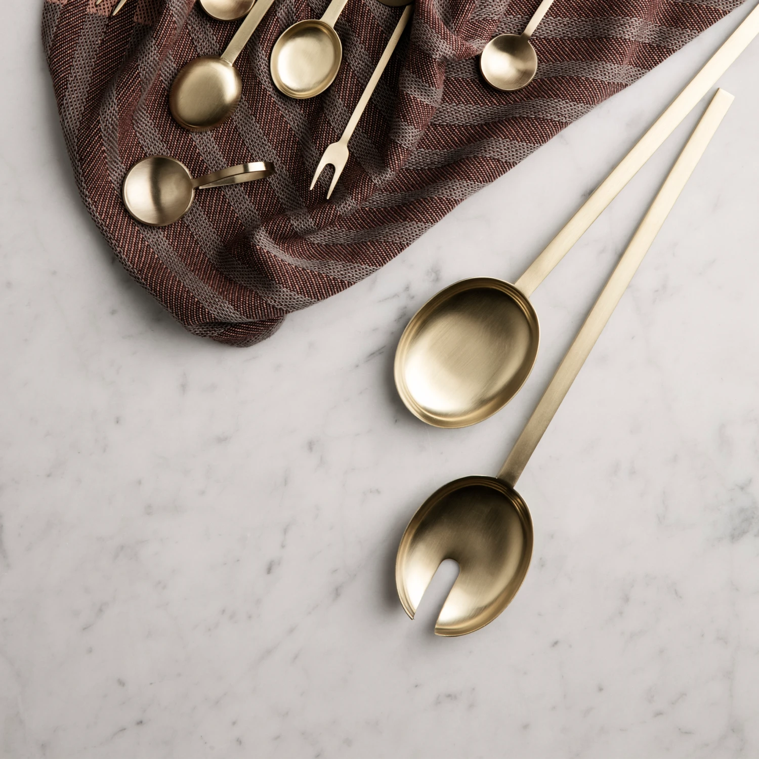 Serve your lovingly made salads to friends and family in style with this pair of brass-coloured salad cutlery. The simple, delicate lines of the Salad Servers will fit right into any table setting.