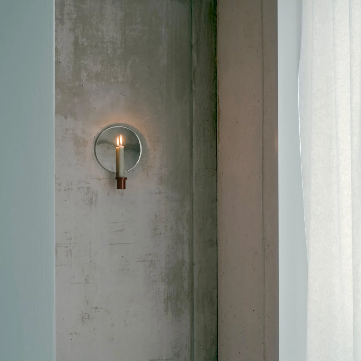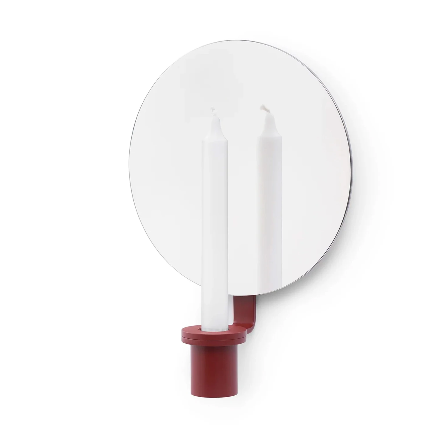 Holocene No. 5 designed by architect David Chipperfield explores the play of reflections, as well as the idea of a simple piece that can be used in different ways. While entirely crafted from steel, the wall sconce bracket and candleholders are coated with a rich, deep shade of red oxide, creating a bold contrast to the highly polished surface of the wall mirror.