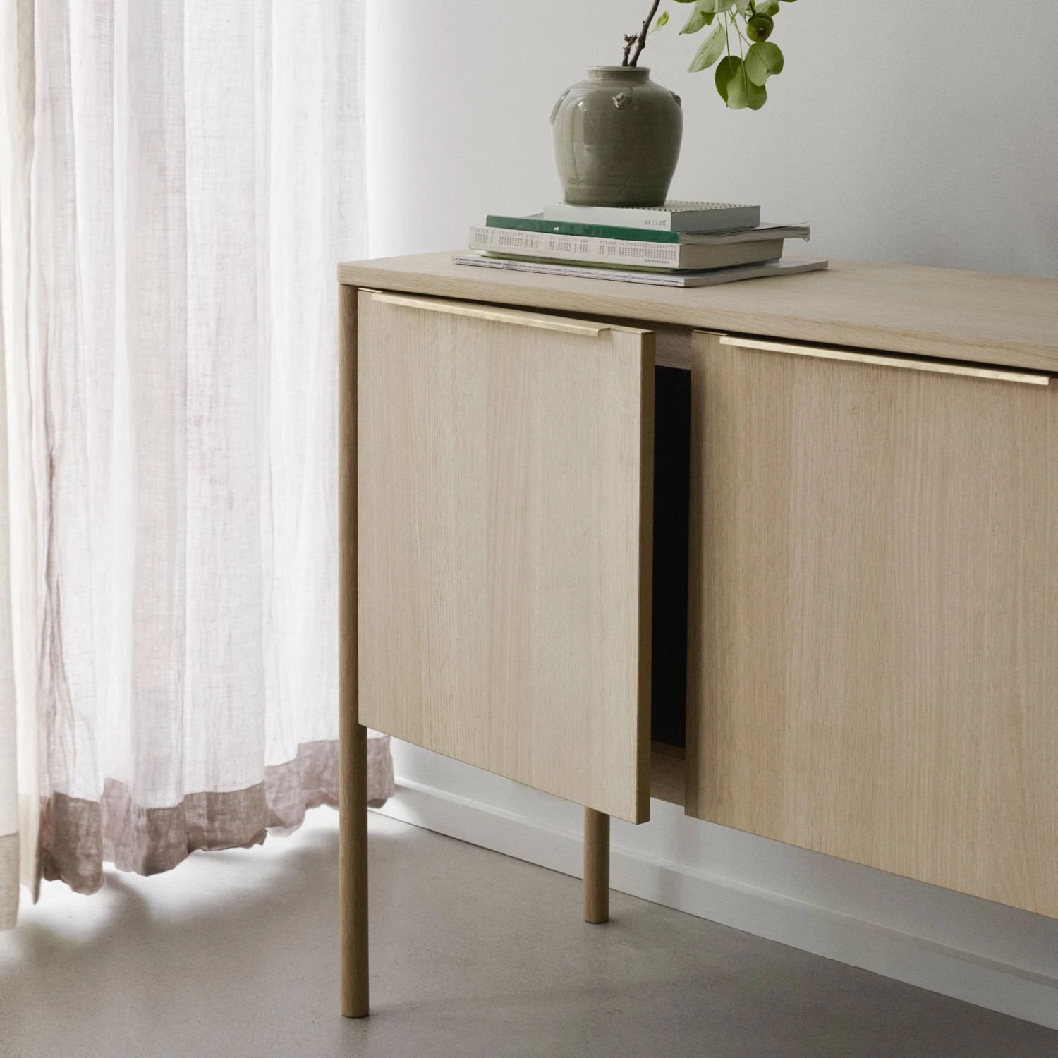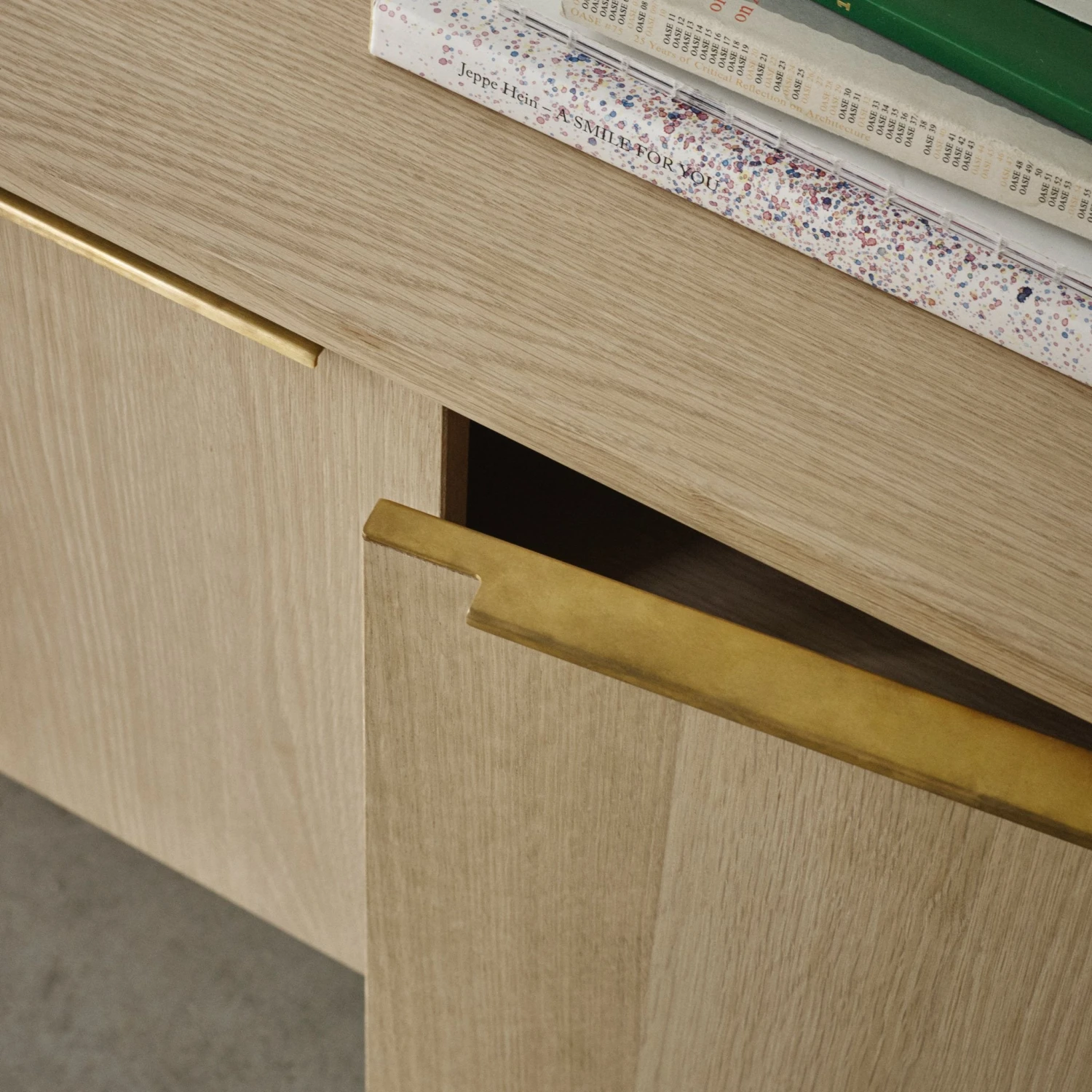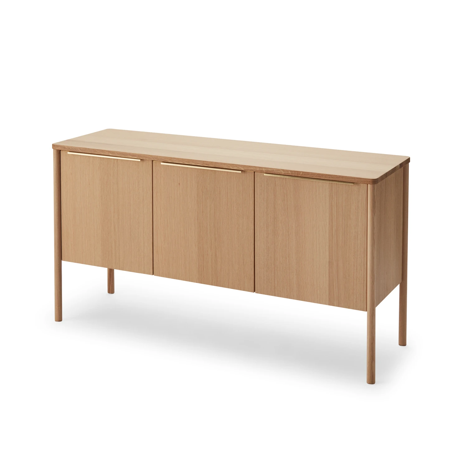 A modern cabinet for the living room and hallway. The long, round legs are positioned at the outer corners while the smart brass-handles on the cabinet doors are aligned with the tabletop. The left room is empty while the rooms on the mid and right are each divided by a removable shelf.