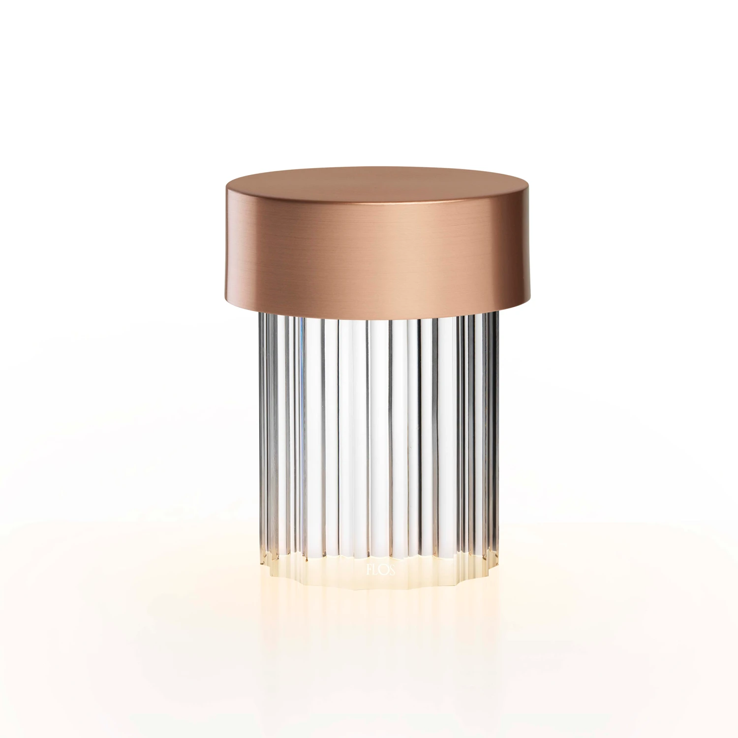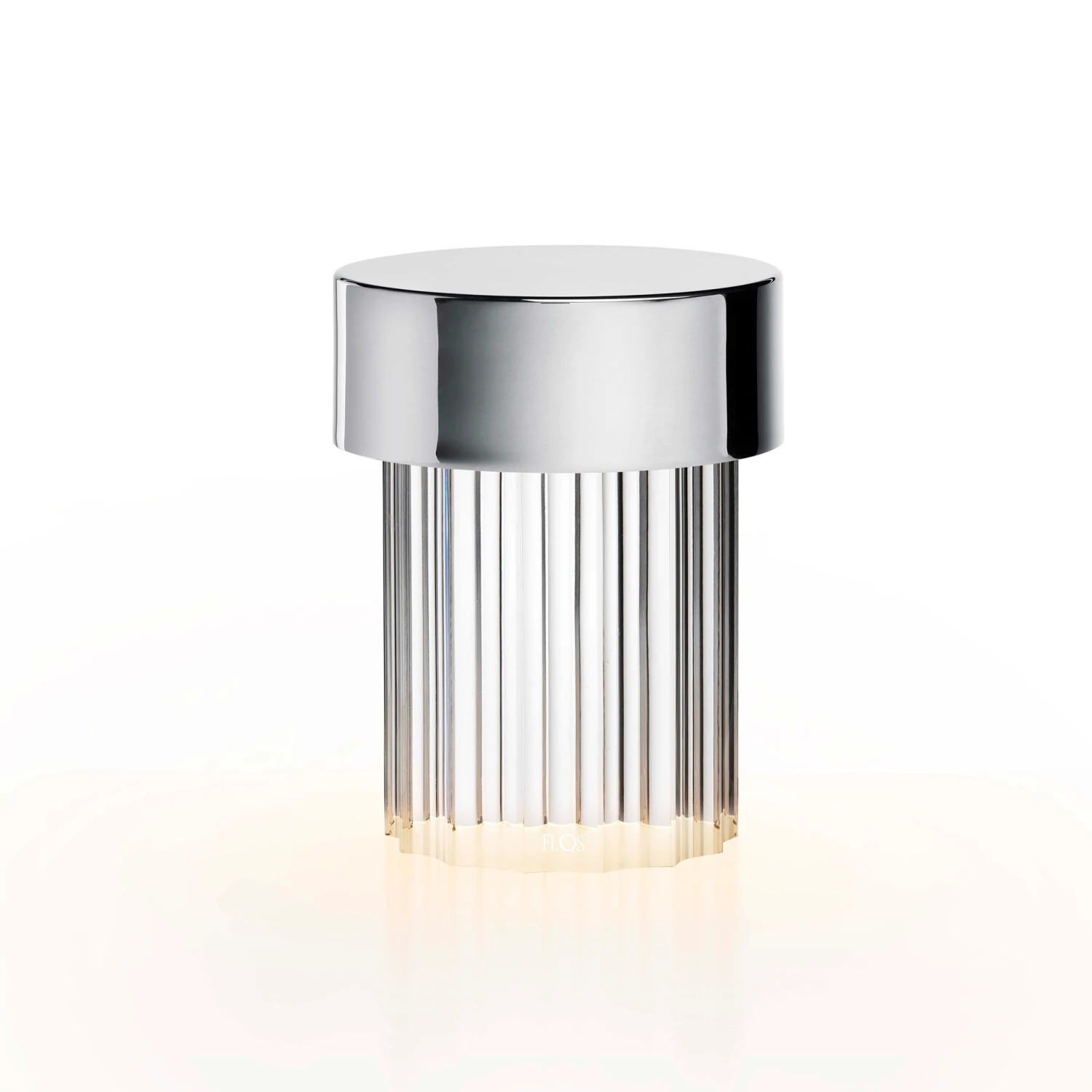Last Order Fluted is a rechargeable table lamp that diffuses light through a transparent solid glass base. The shape makes reference to the architectural typology of ancient columns.Â