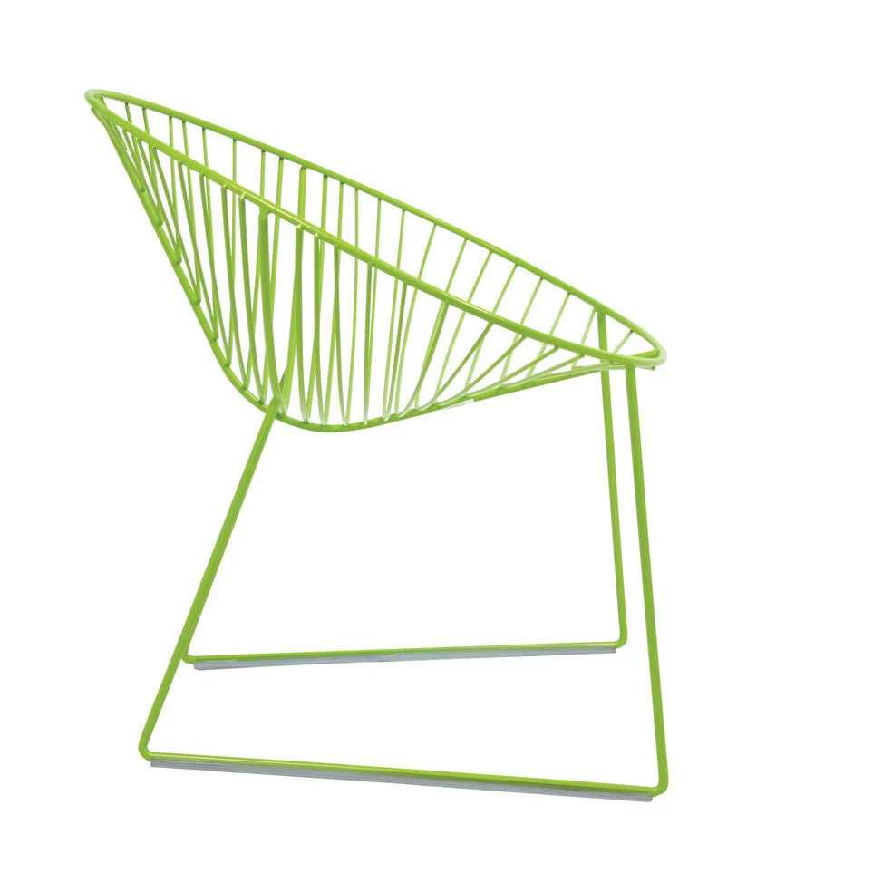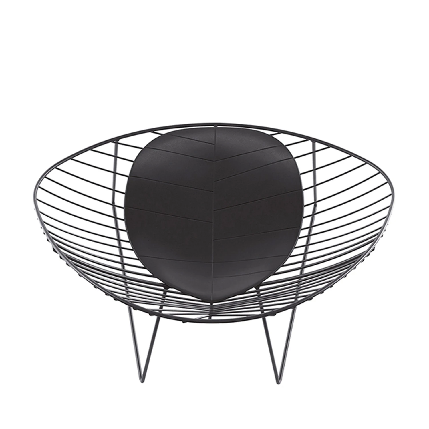 Painted steel rod in white, green or mocha suitable for outdoors and indoors . A seat pad suitable for exterior use is available separately made in polyurethane with an imprinted veined design (green) or a leather version suitable for indoors.