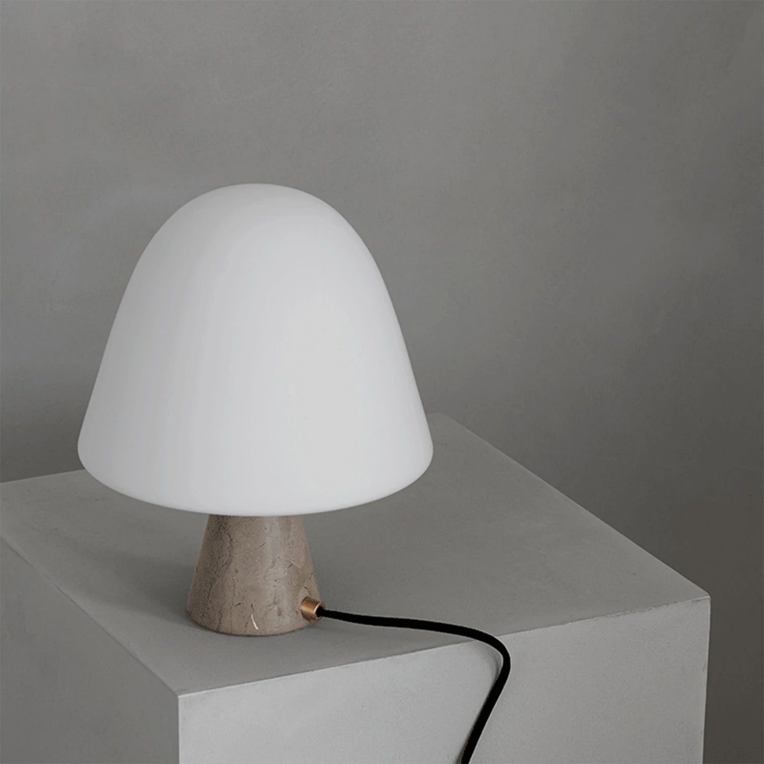 Made from solid stone, glass and brass, Meadow is a table lamp that balances materiality with light. A simple composition of a dome-shaped shade that is mirrored in the smaller stone base gives Meadow an organic, unassuming look.