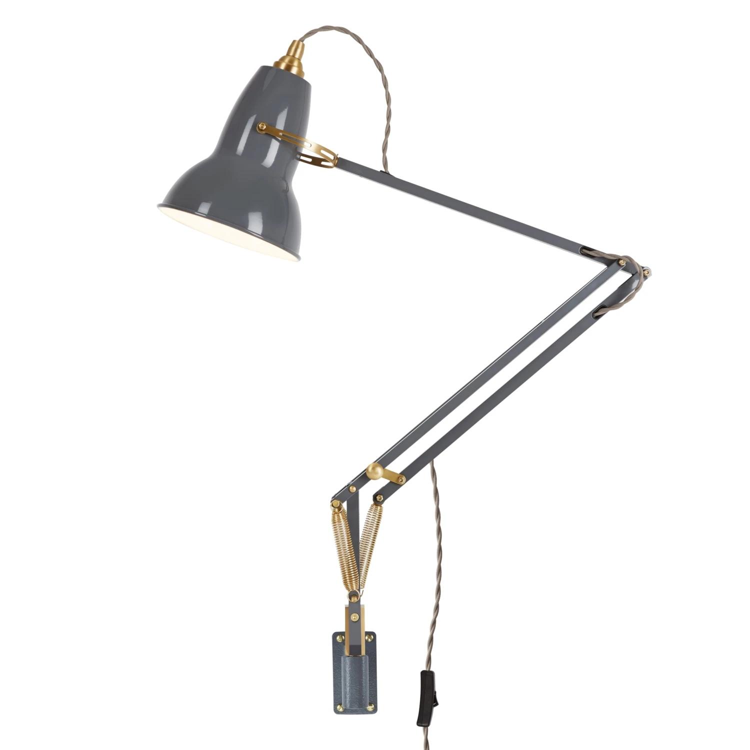 Gloss paint finish. Aluminium shade. Painted aluminium arms. Cast iron wall bracket. Brass shade cap, bridle, spacers and fittings. Twisted woven fabric cable. Anglepoise® constant tension spring technology.Â