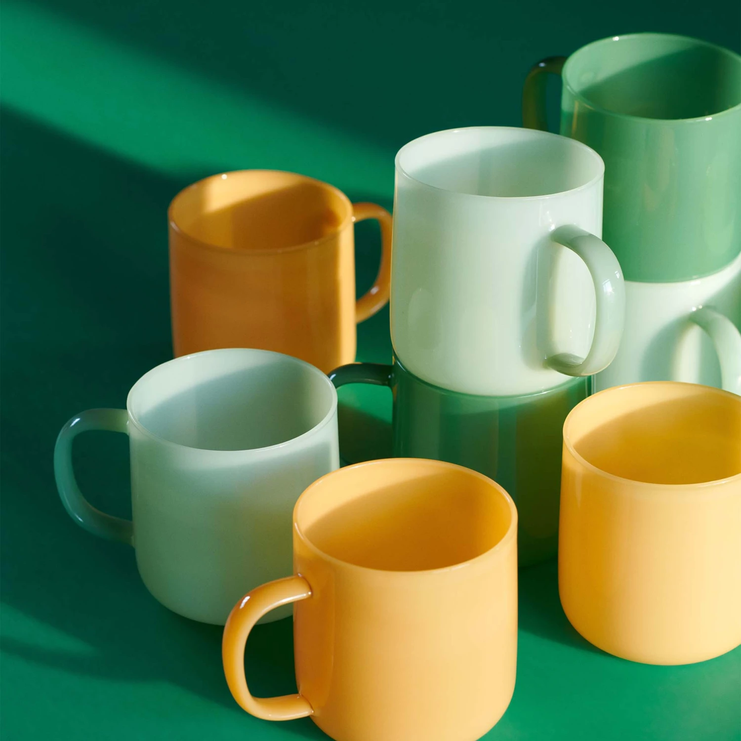 Strong, colourful borosilicate glass is used to create these distinctive and functional mugs from HAY. Suitable for both cold and hot drinks, with a straight body and round, symmetrical handle.