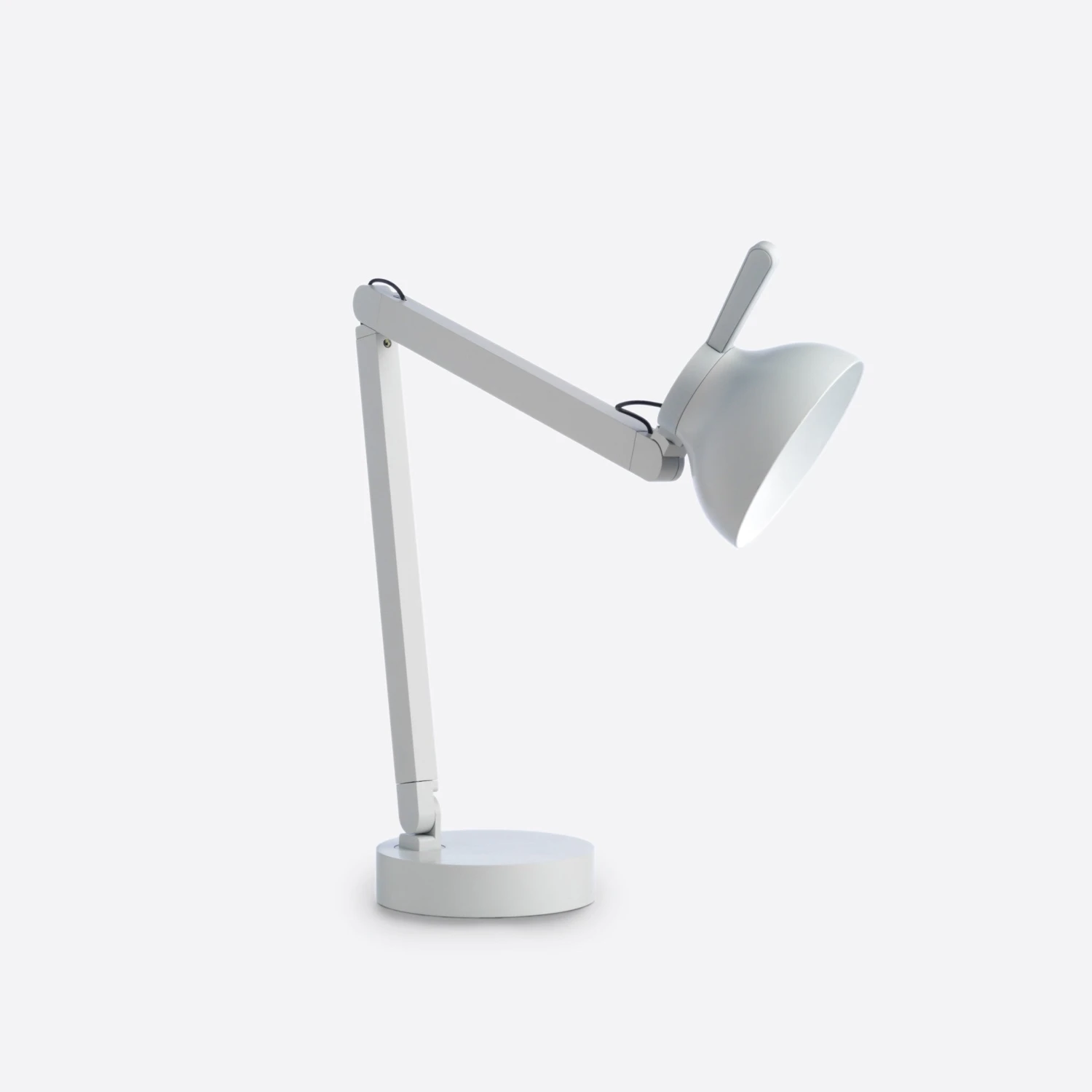 PC table light is refined and precisely engineered with a polycarbonate head, aluminium arms and base. The design conceals gas springs that enable the arms and head to hold their position wherever they are moved to.