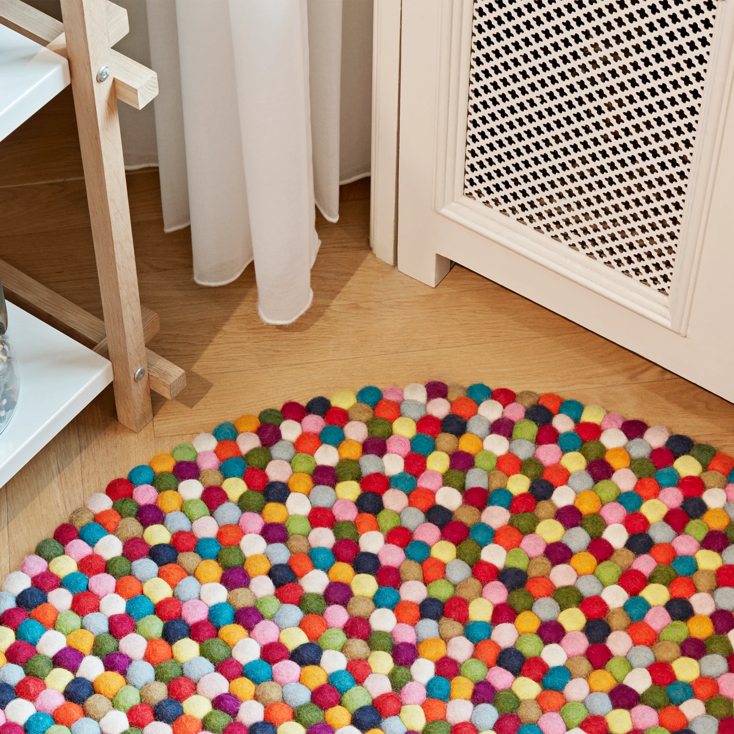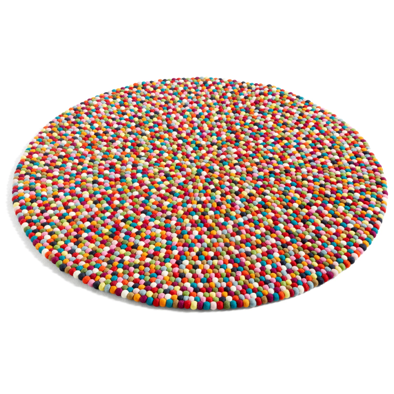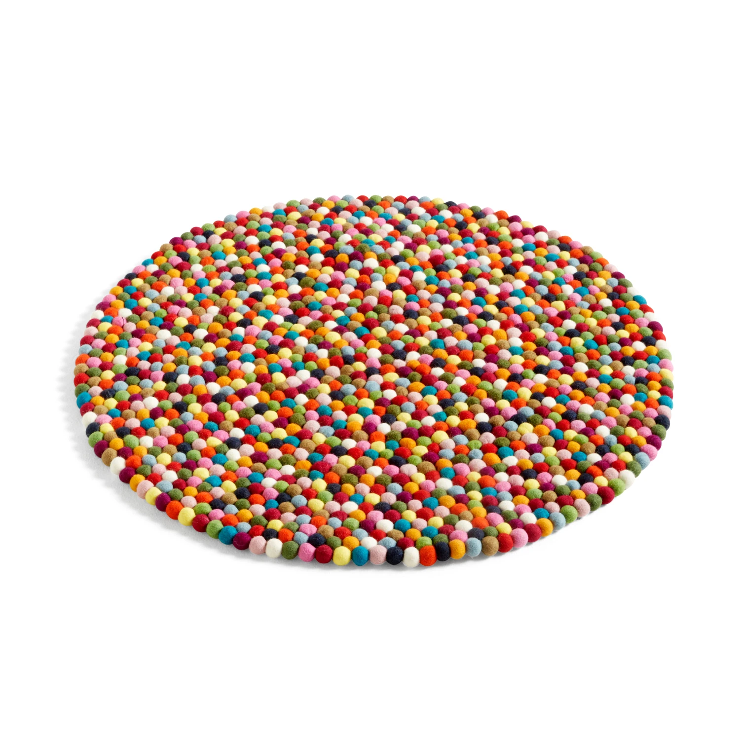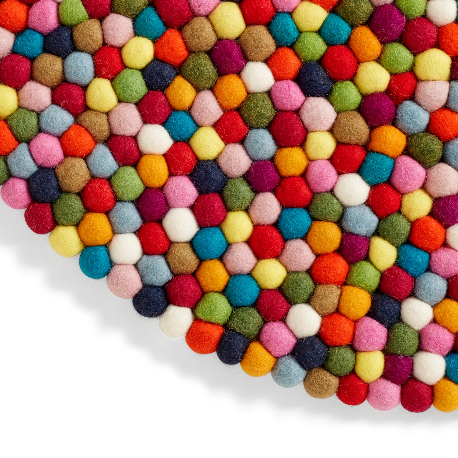Handmade in Nepal using traditional craft methods, the brightly-coloured felt balls are individually rolled, strung on a cord and sewn into a circular rug that’s ideal for brightening up any interior space.