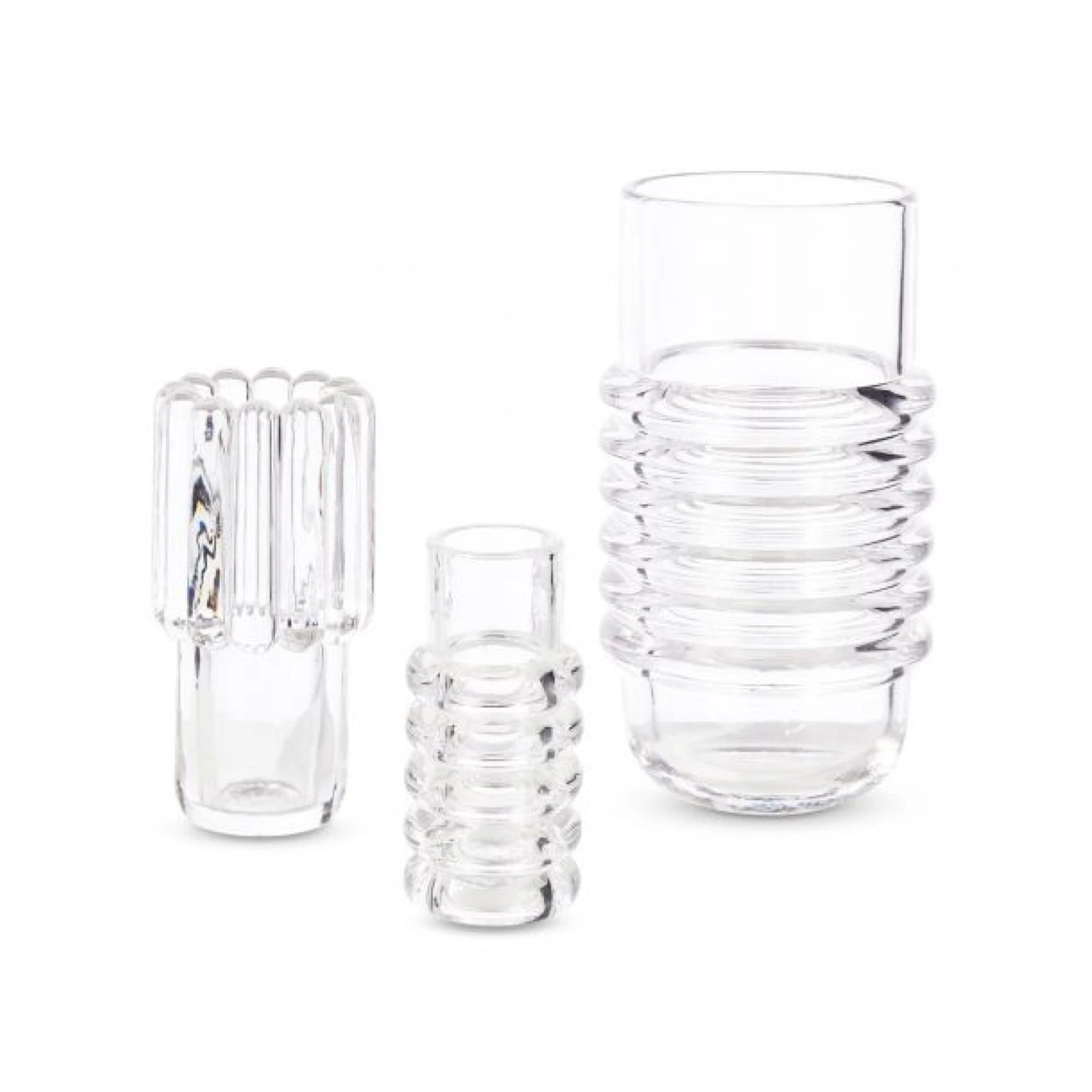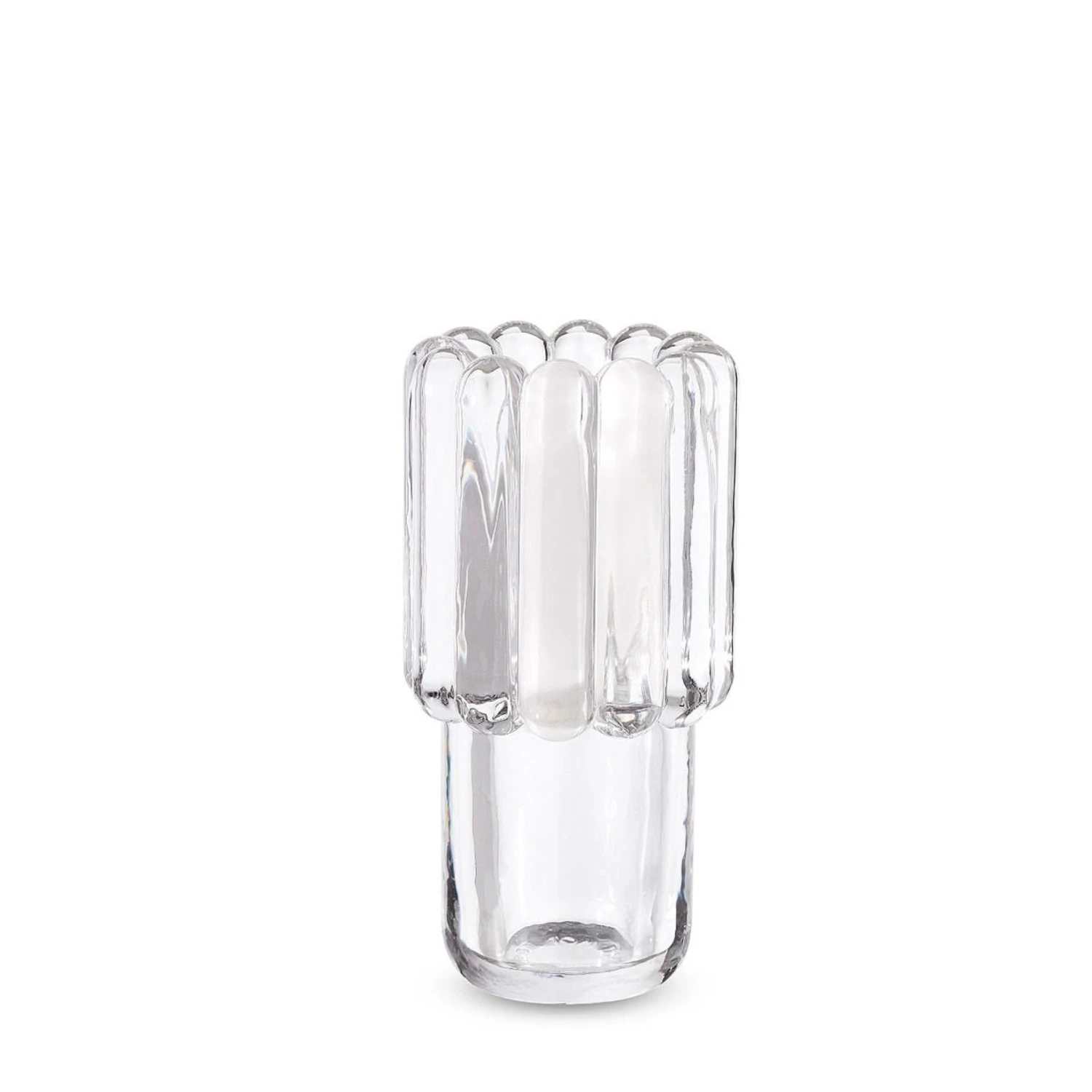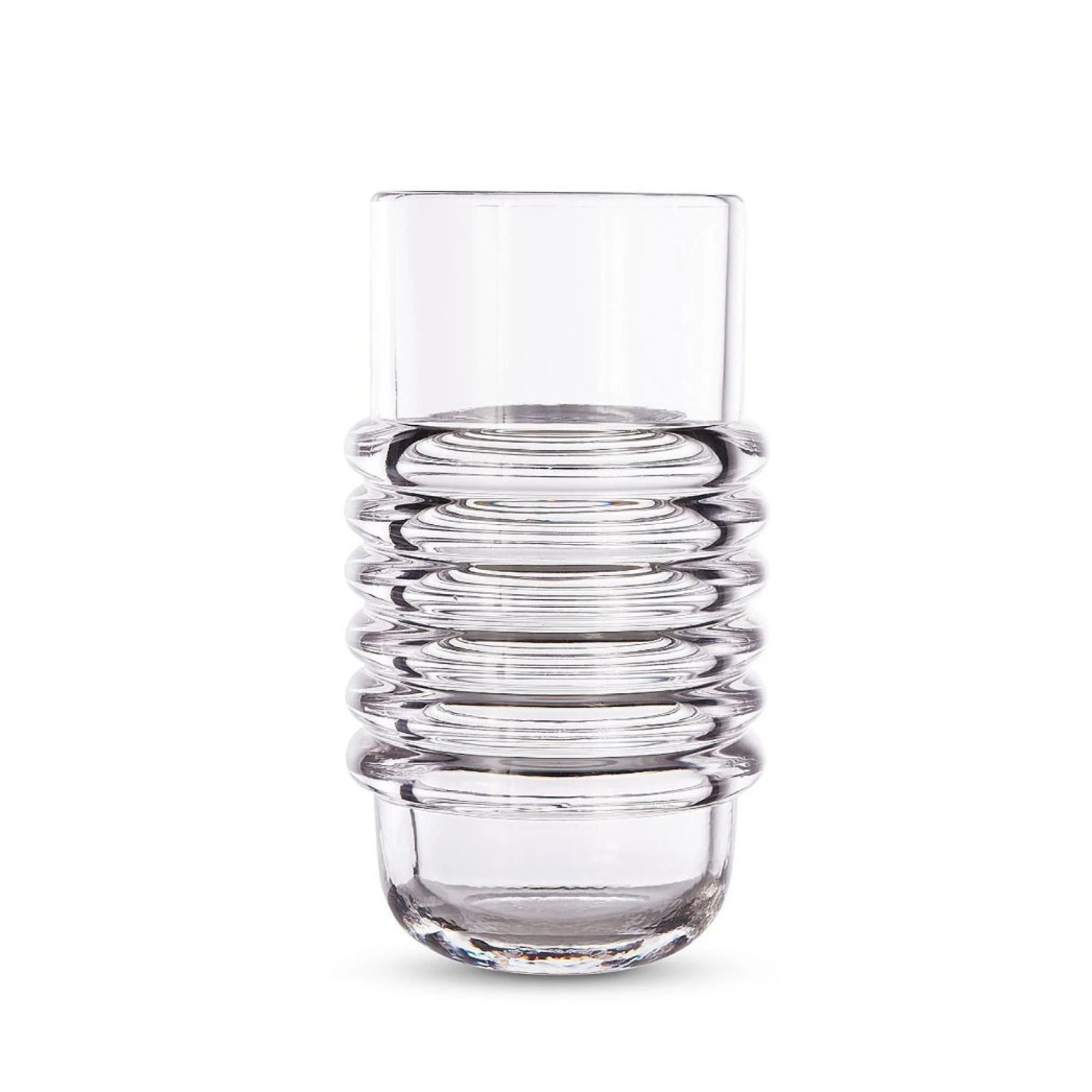 A collection of heavyweight industrially pressed vases crafted from thick-set transparent glass. The curves and grooves of the Press homewares collection combine to create a mesmerisingly bold silhouette. Manufactured by dropping globules of molten glass at 1,200 degrees centigrade and then pressing into two or three-part iron moulds the Press vase is carefully crafted to last a lifetime. The perfect vestibule for stylishly keeping your flowers fresh.