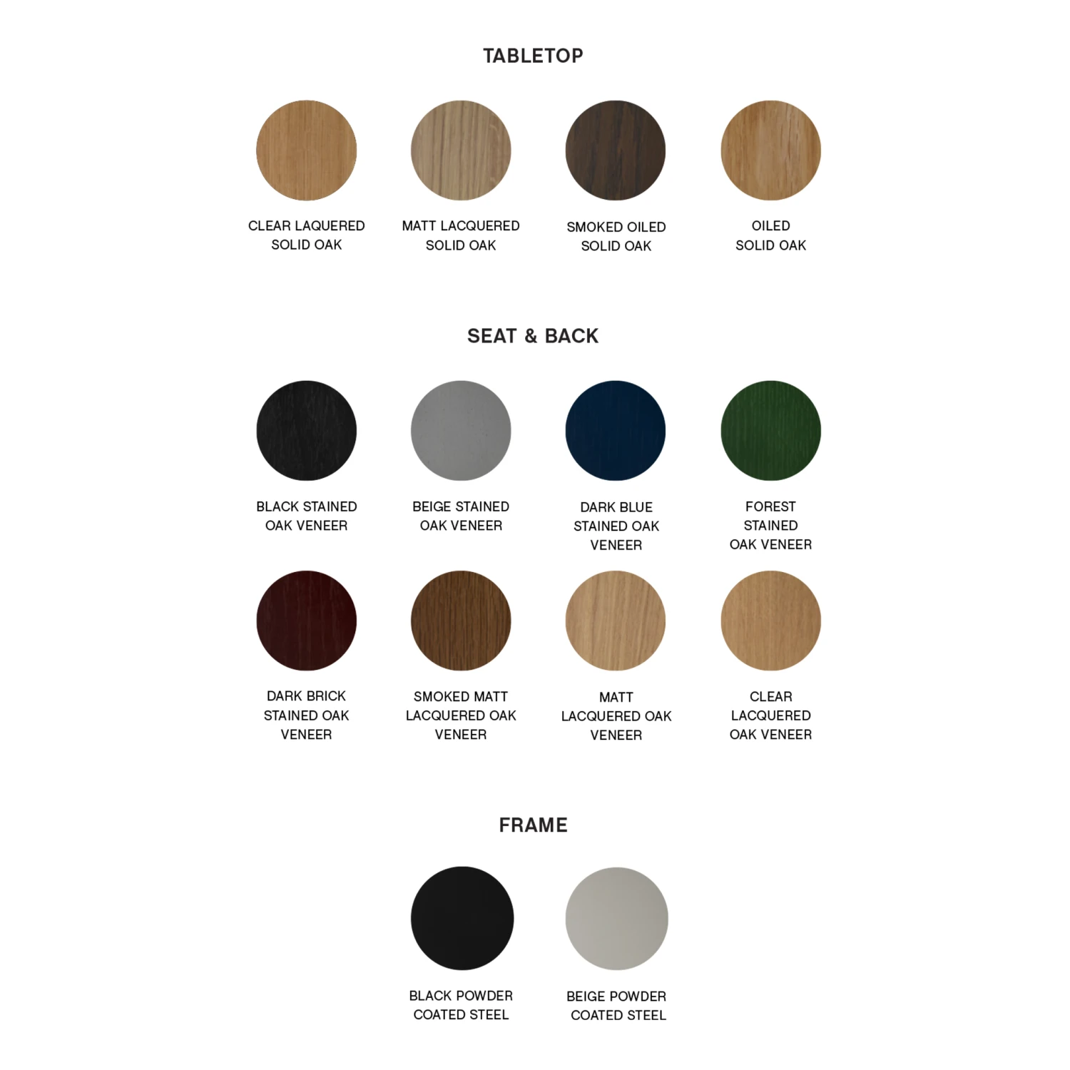 Black or beige steel frame, with top in clear lacquered, matt lacquered or smoked oiled solid oak.