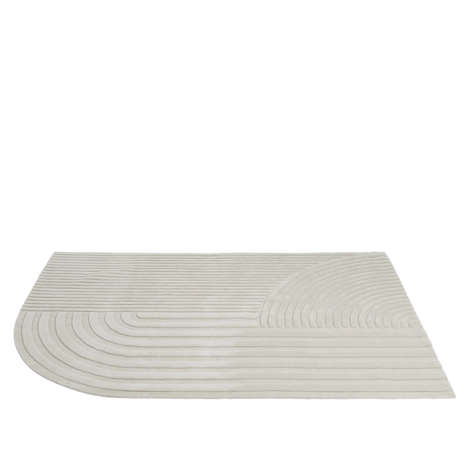 Relevo is a soft rug with a distinctly sculptural quality. Its striking graphic pattern is produced by trimming the tufted wool in different levels, thereby creating an eye-catching shadowplay that gives a sense of being two-tone rather than monochrome. The rug’s single rounded corner gives it a unique character, a dynamic expression in any setting.