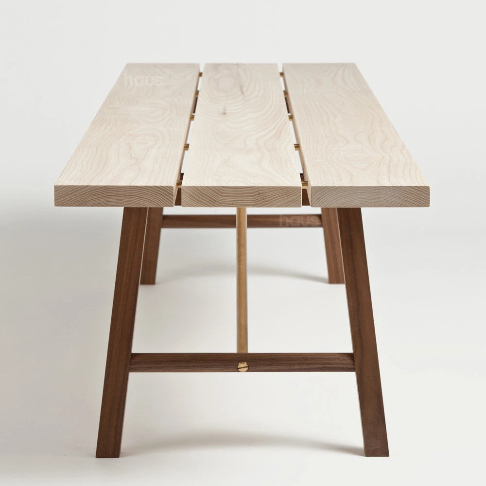 One thing is for sure; this low slung, carefully detailed bench that features contrasting woods of pale matt finished ash and rich walnut is sturdy enough to take it and still look beautiful.