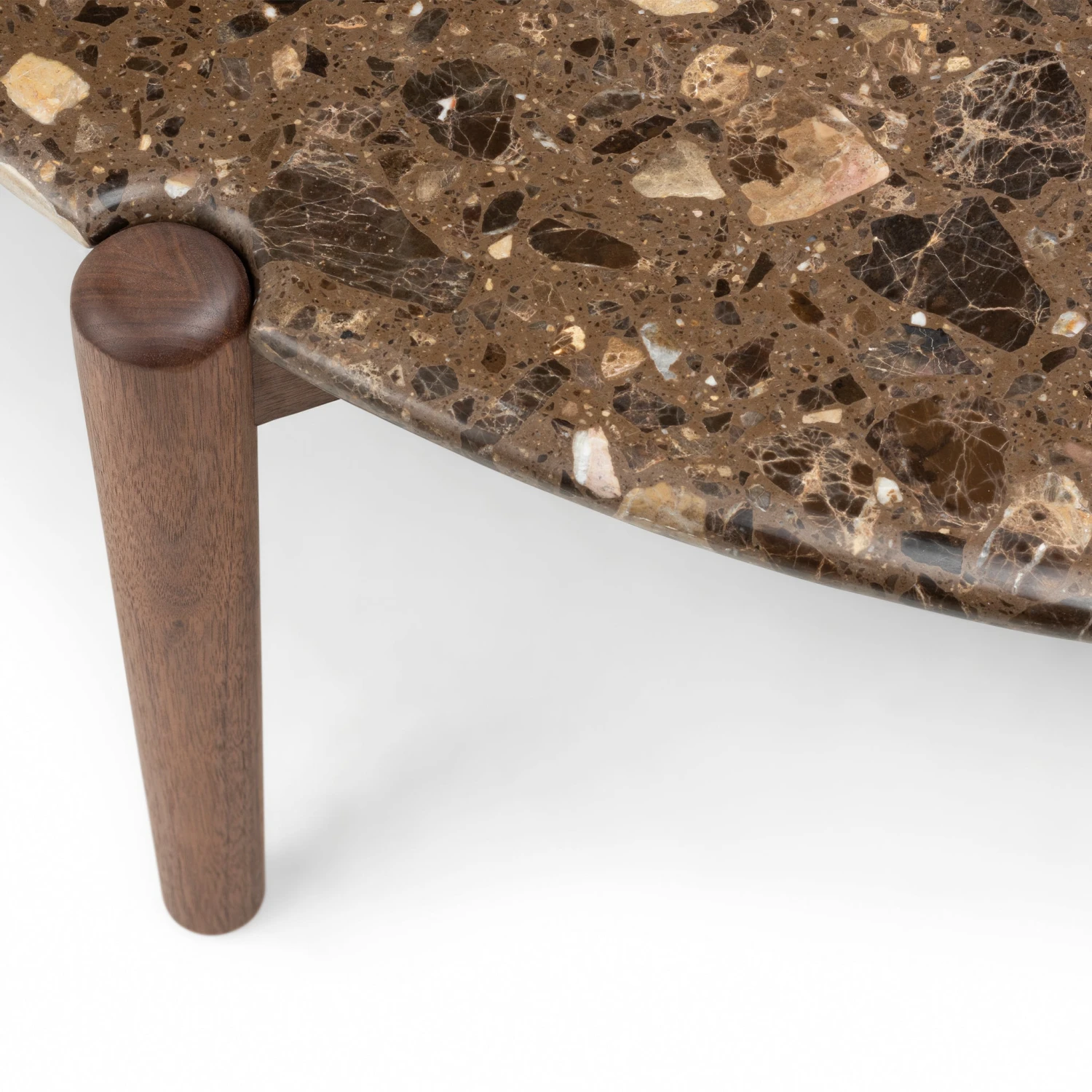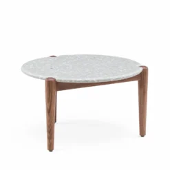 A tabletop of terrazzo rests upon slender solid wood legs – two sizes available.