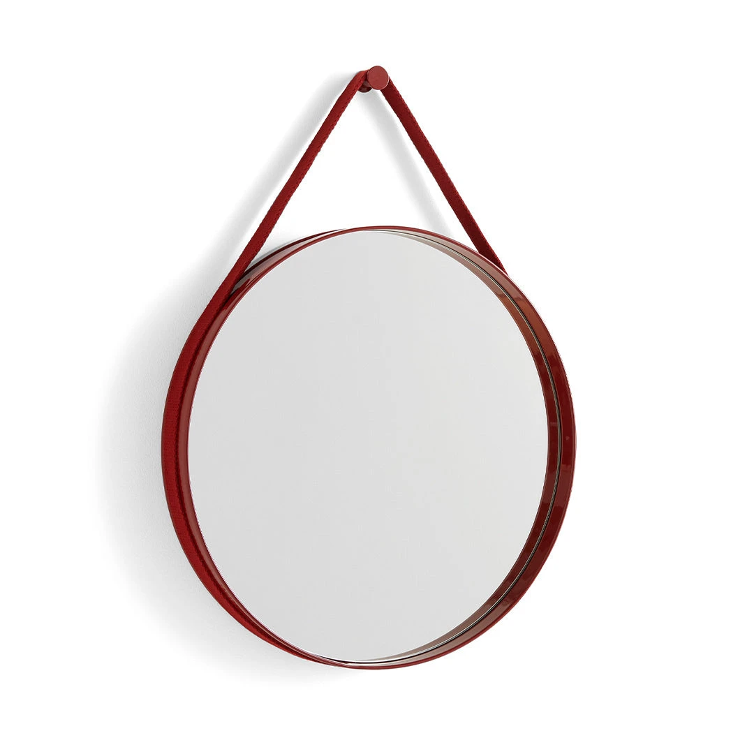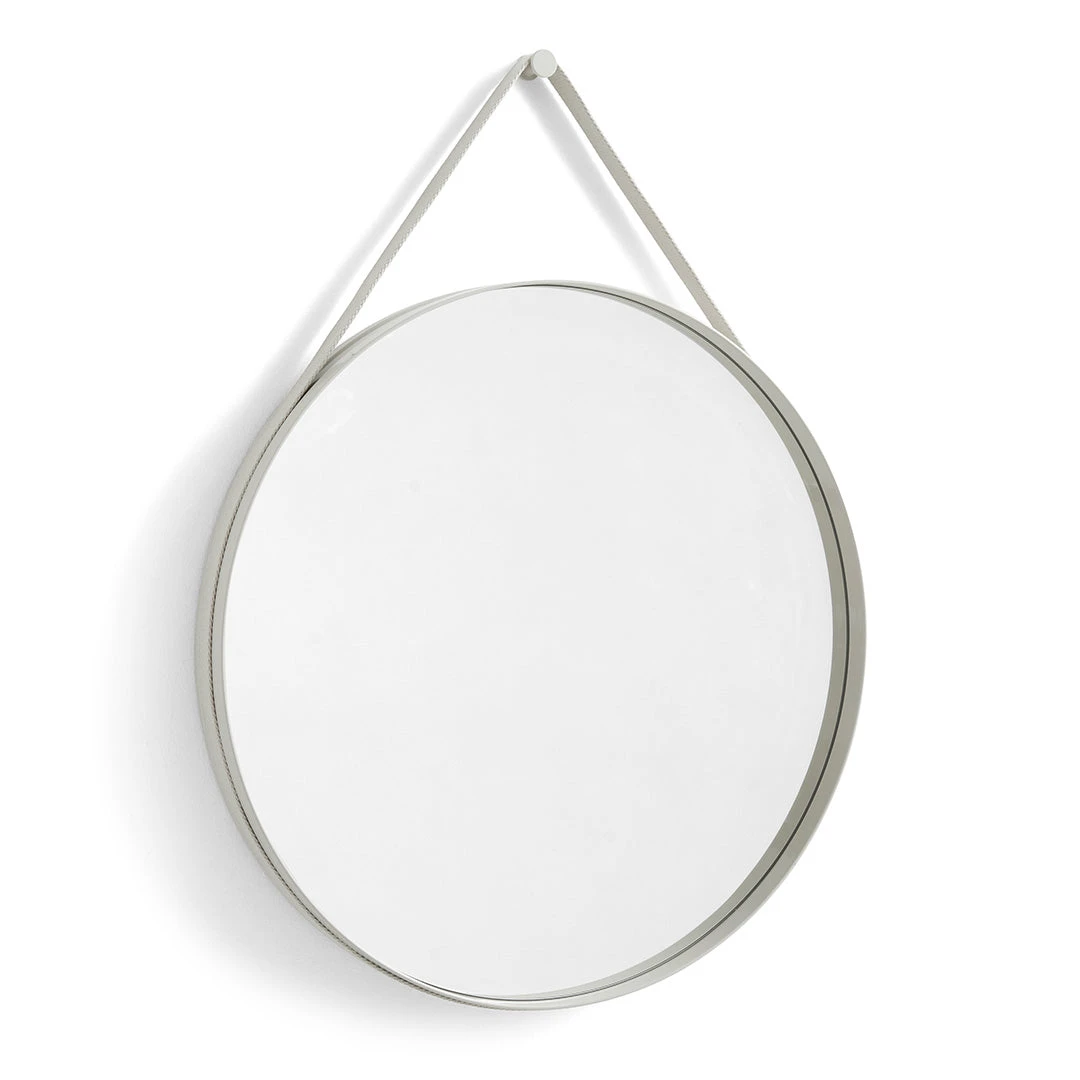 Strap Mirror’s clean circular design makes it ideal for hanging in bathrooms, bedrooms, and entrance halls, featuring a subtle groove around the edge to contain a sturdy woven strap for mounting.Â