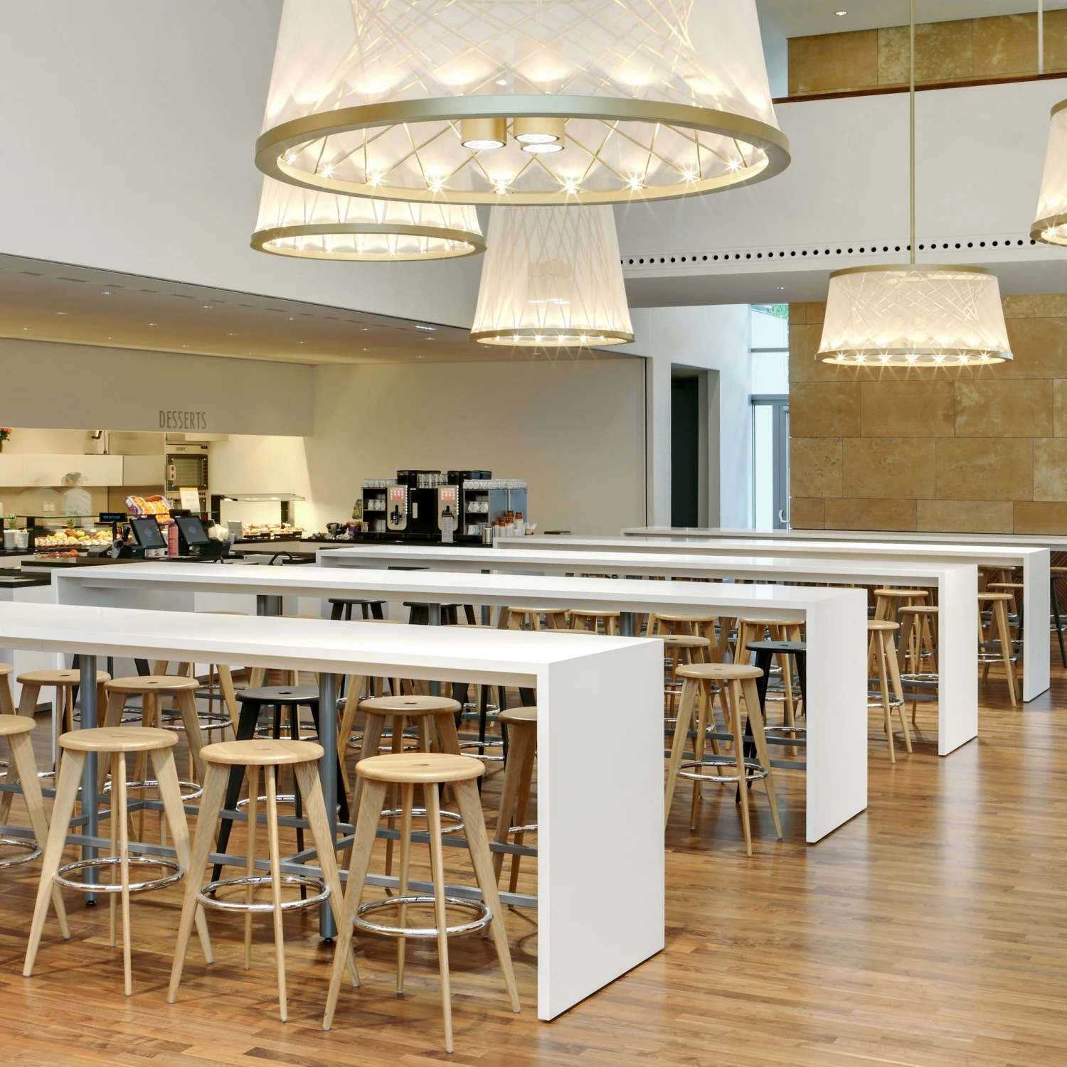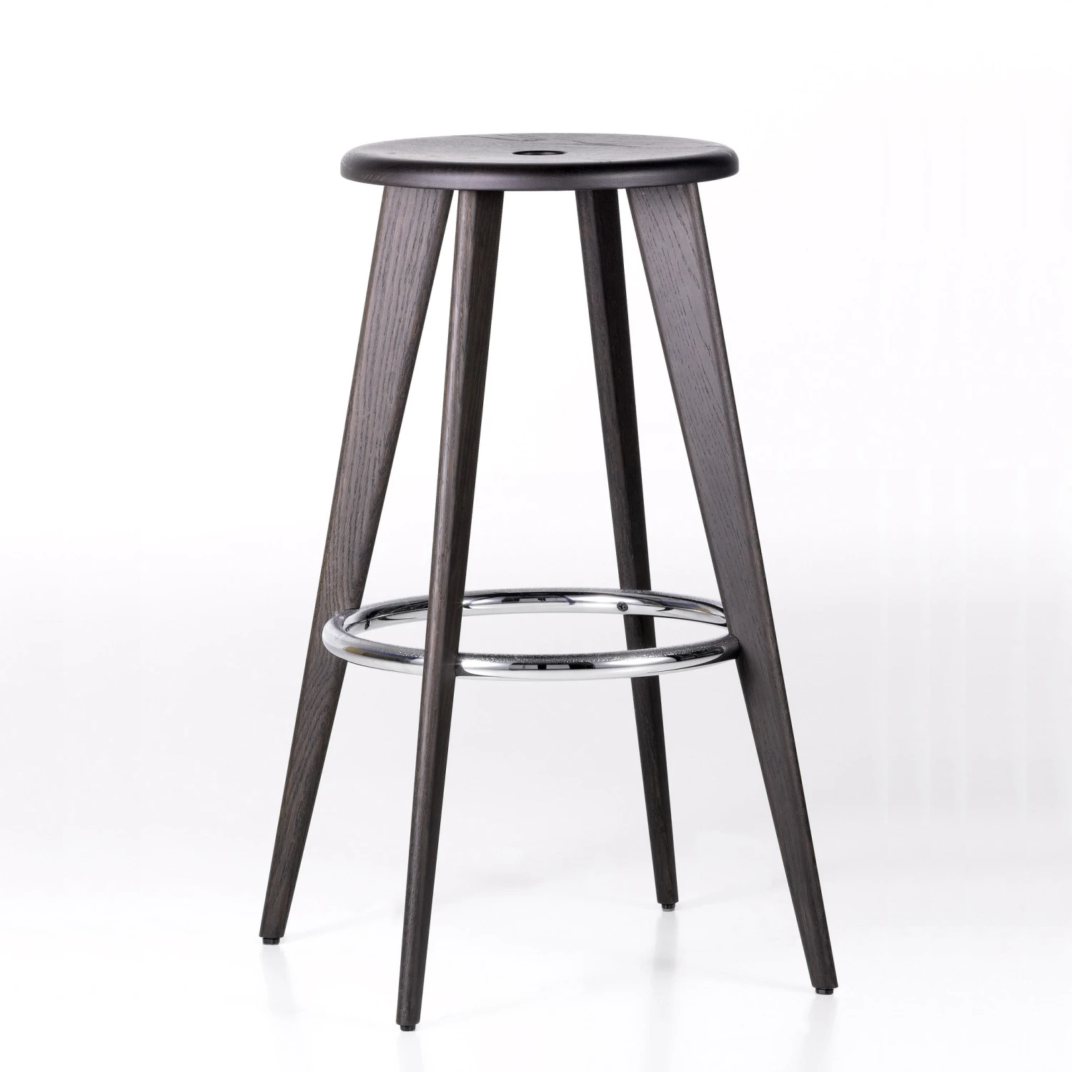 For the design of Tabouret Haut Jean Prouve drew on a traditional type of bar stool that is still in common use today, a round seat disc resting on top of four long, canted legs. A ring is mounted to the inside of the legs at about a third of their height from the floor, increasing the rigidity of the construction and also serving as a comfortable footrest. Prouve’s interpretation of this classic type is distinguished by its simple, unpretentious appearance, lucid construction and harmonious proportions.