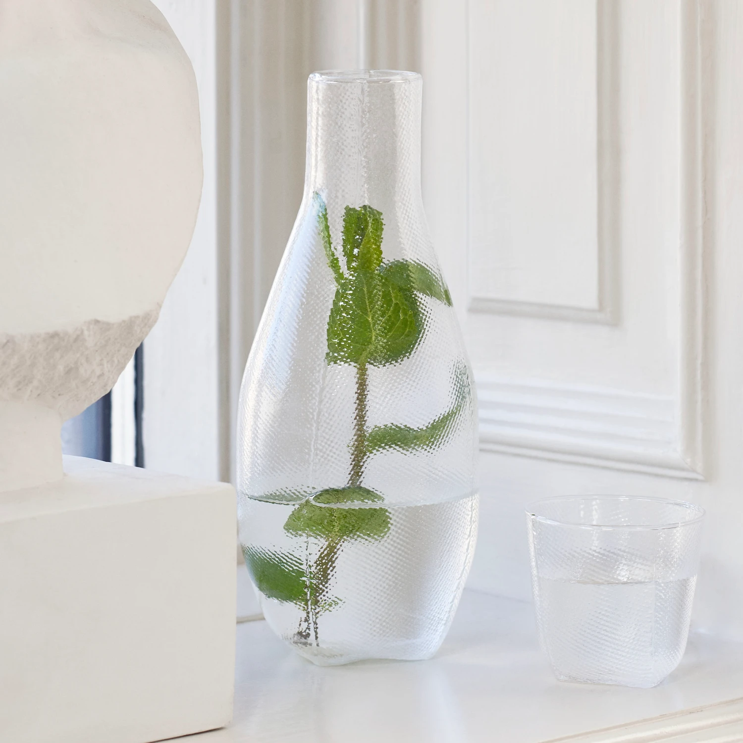 A progressive glass collection evolved through material experimentation. Originally formed by blowing molten glass into stitched textile bags, the design is named after the Spanish word for textile.