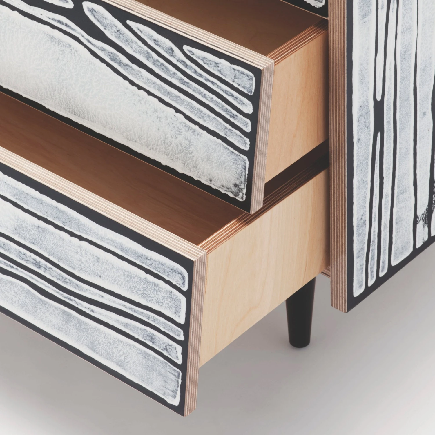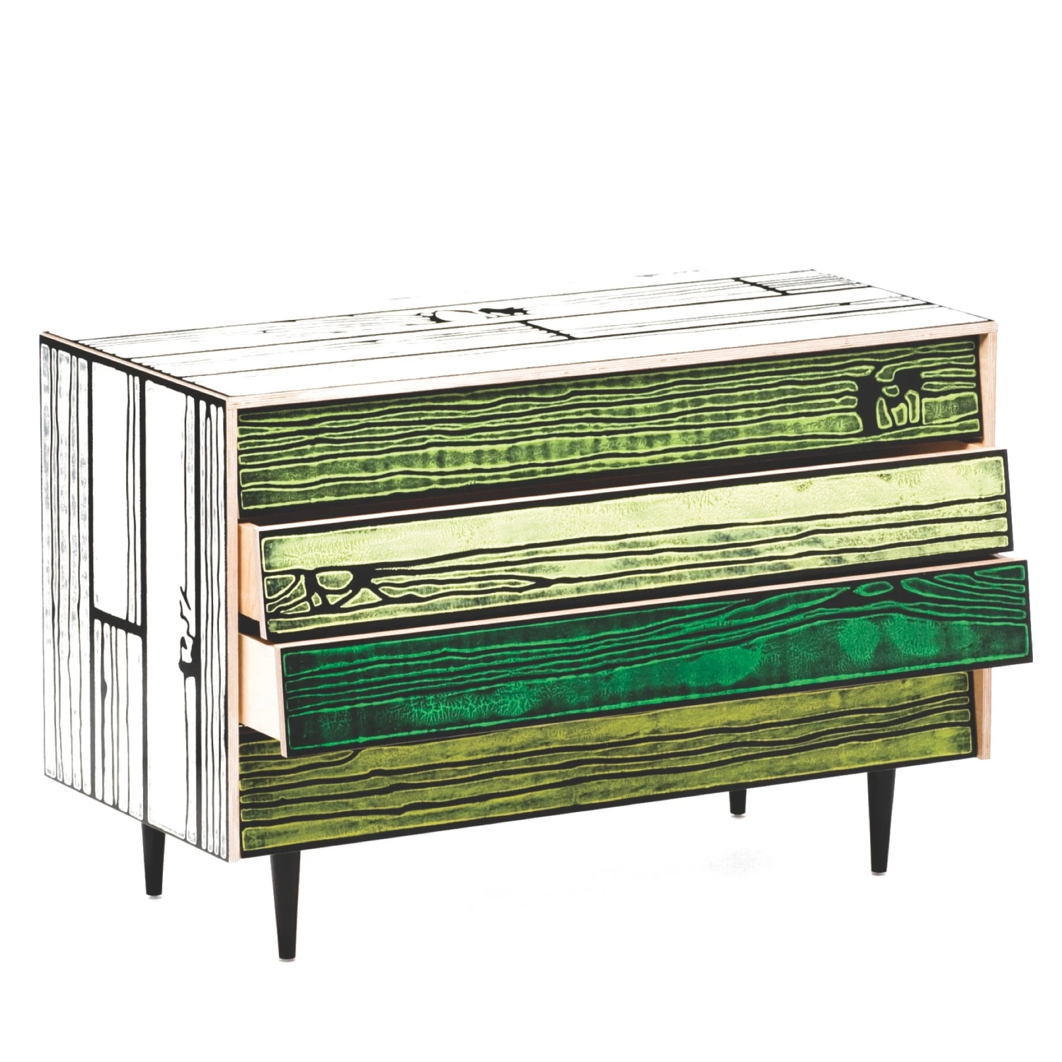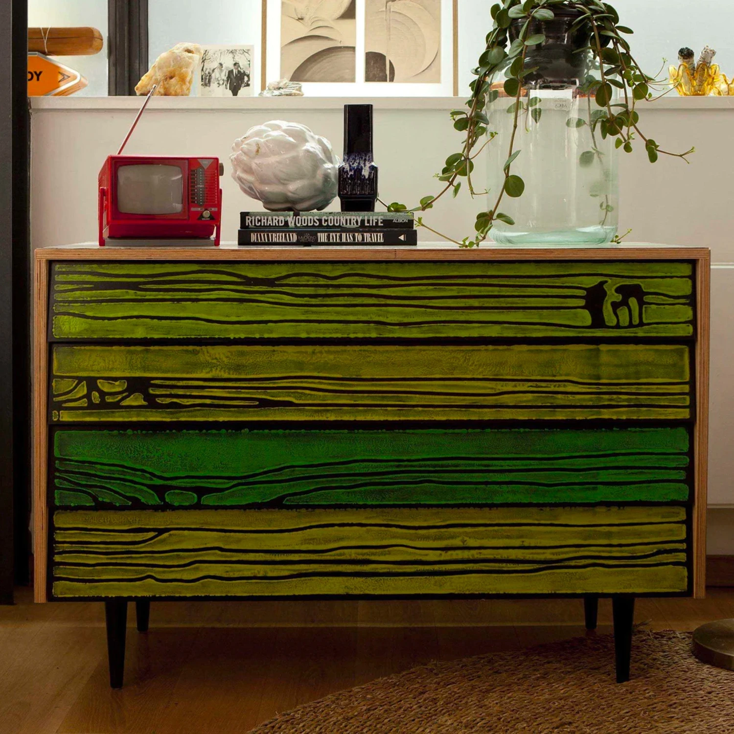 Richard Woods’ strikingly colourful wood-grain block prints are applied to Sebastian Wrong’s utilitarian furniture – reminiscent of mid-century designs – in this seminal collaboration between artist and designer.